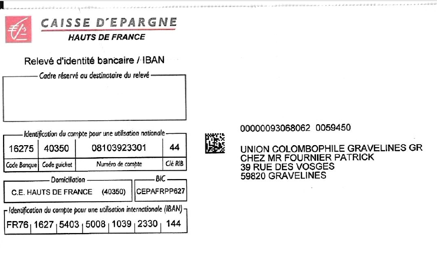 Les chèques à l’ordre de : « Union colombophile Gravelines » sont à envoyer à : FOURNIER Patrick, 39 rue des Vosges – 59820 GRAVELINES
