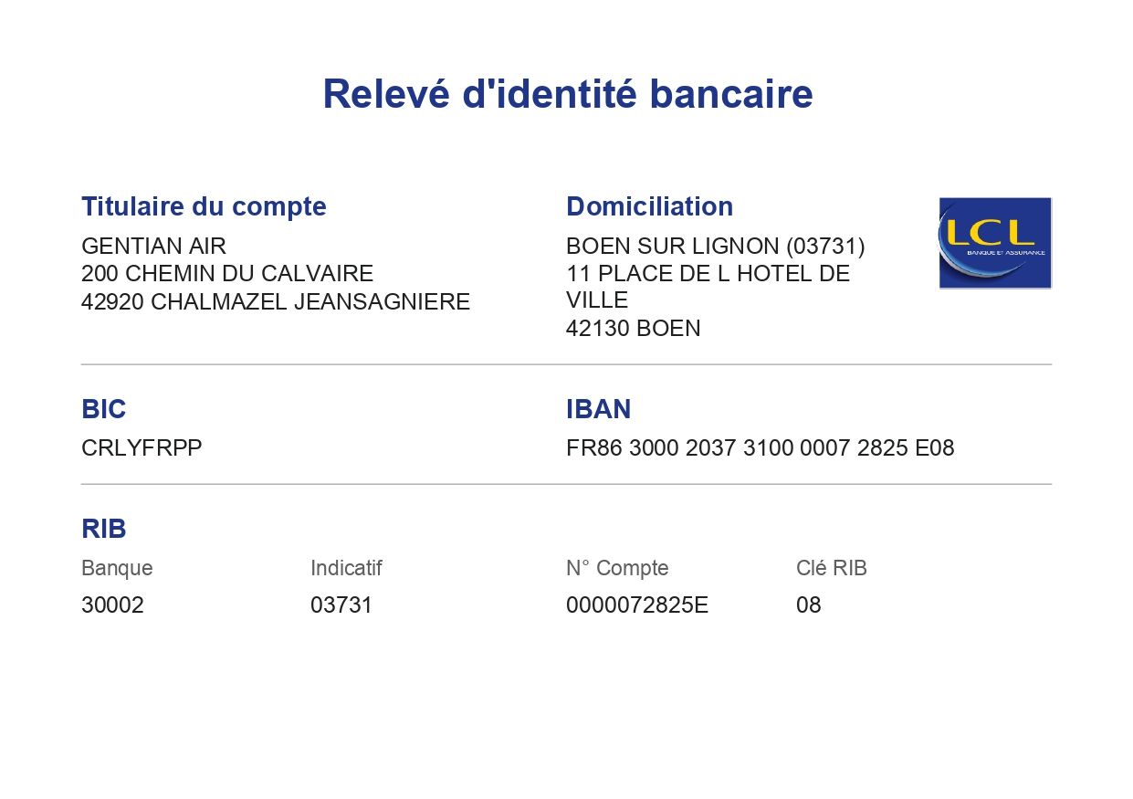 Les chèques à l’ordre de GENTIAN AIR sont à envoyés à : GBL 200 chemin du calvaire 42920 Chalmazel Jeansagniere