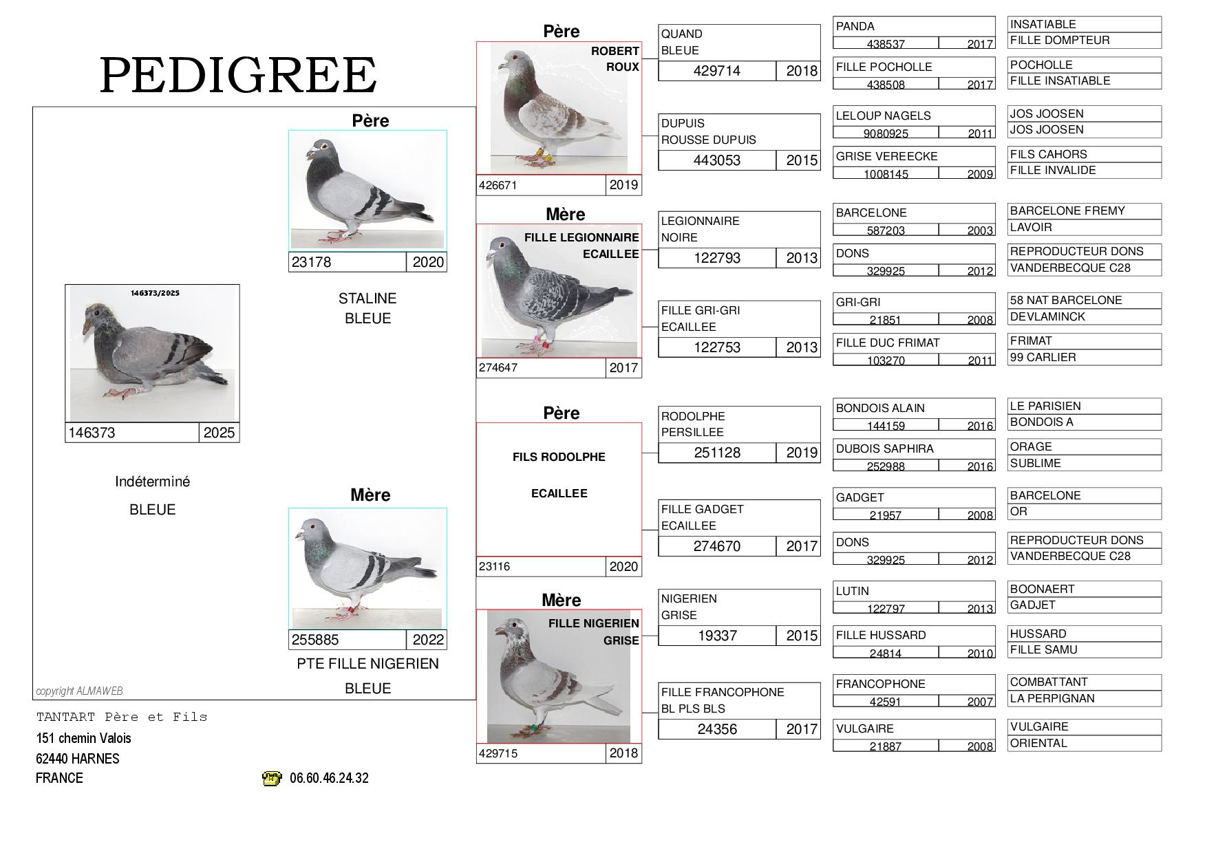 Père :Le « Staline » un pigeon qui l’an dernier est rentré au début de la nuit et a remporté le 2ème de PAU au CIFR