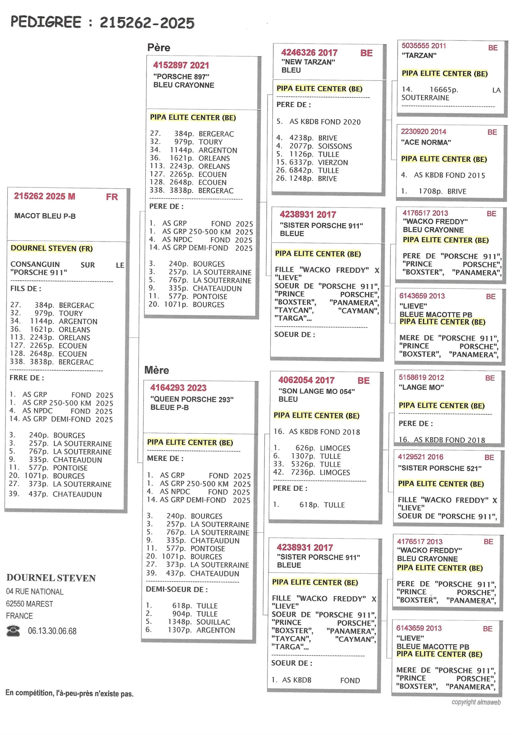 Pour conclure, le « 262 » est le frère de la meilleure femelle de jeu 2025 de la colonie DOURNEL, la célèbre 023584/2025, mise en lumière dans un article sur la page PIPA ELITE CENTER (BE). Voici son palmarès complet :