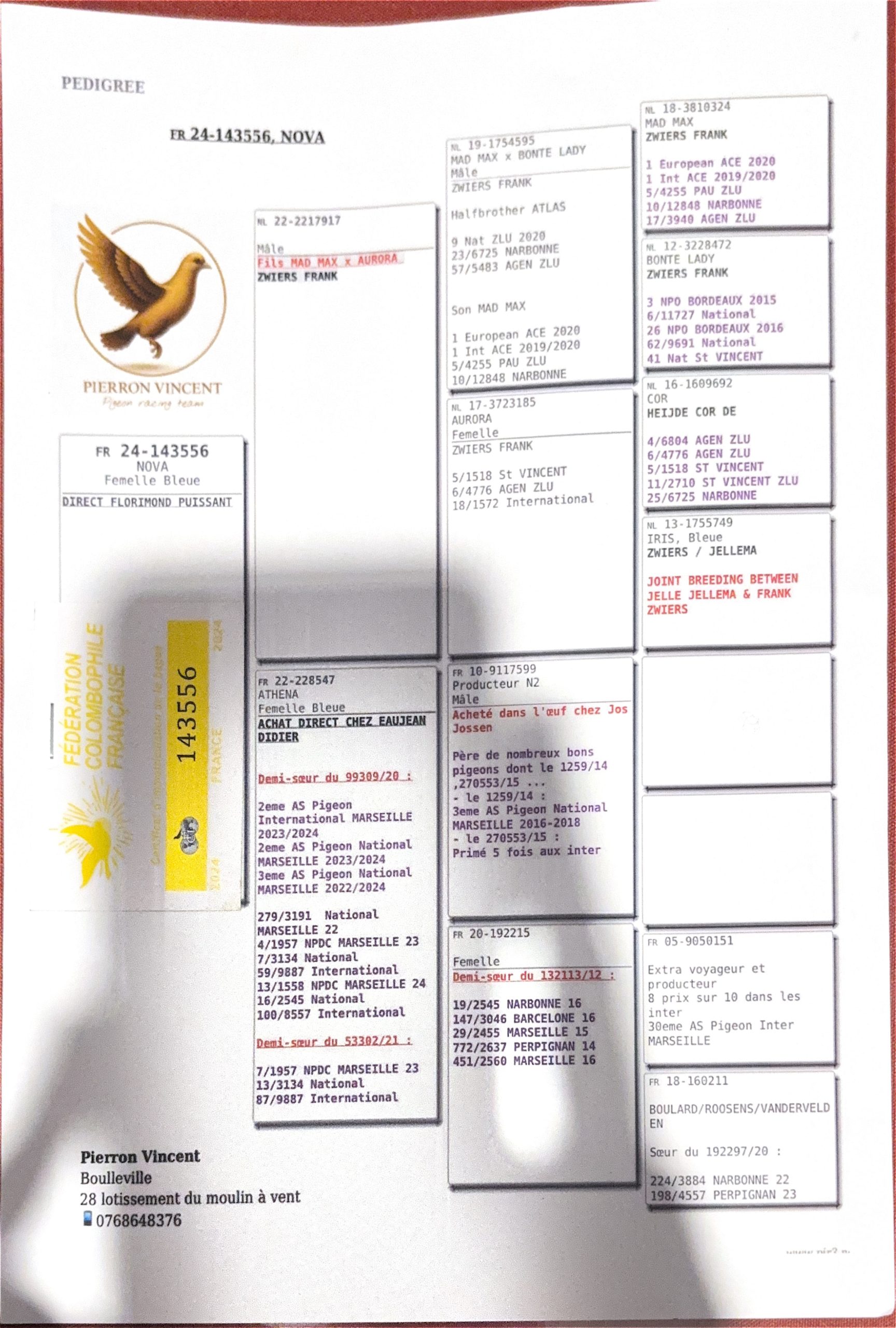 Origine : Nièce du 20/99309 de Beaujean Didier As pigeon CIF 3 ans sur Marseille Et 2ème as international 5 ans sur Marseille