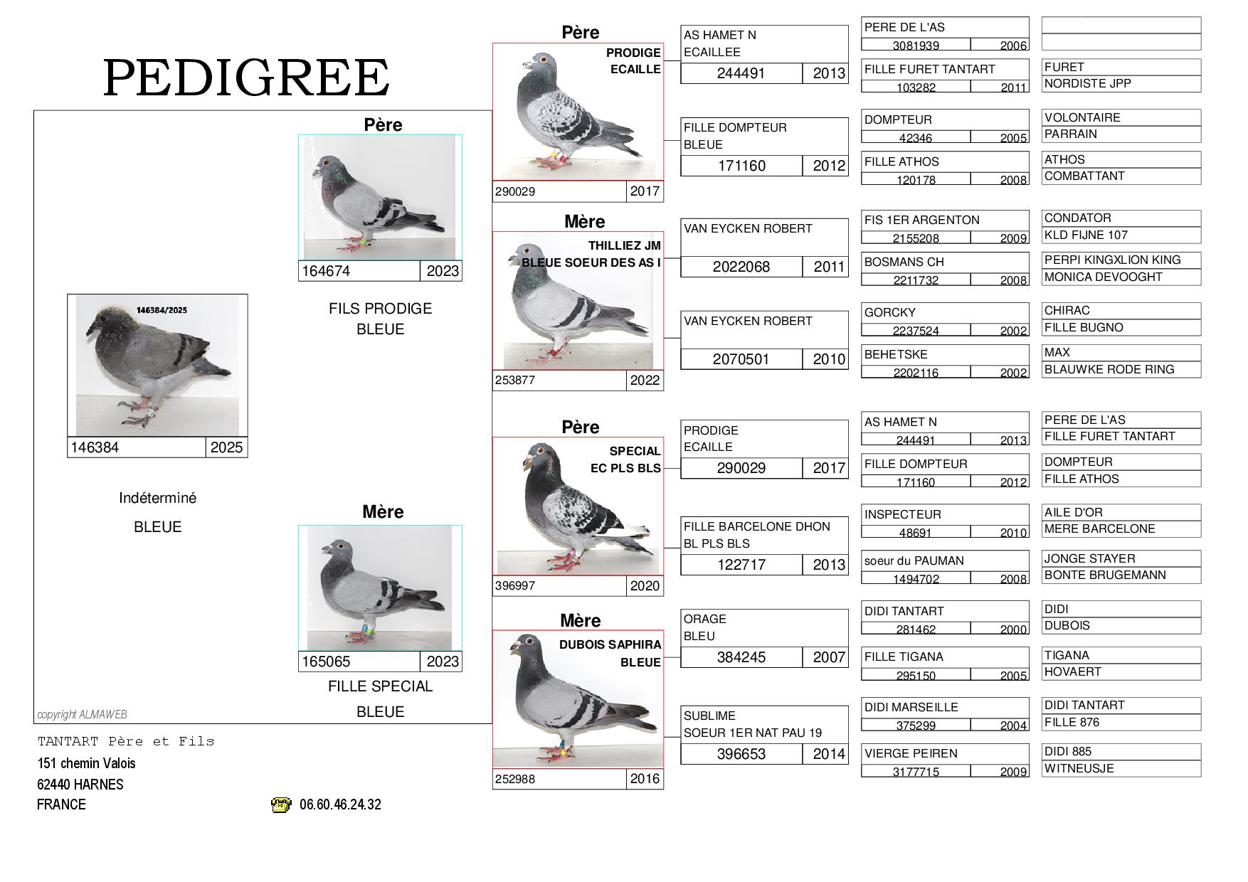 Père : Le père est le meilleur 2 ans du pigeonnier qui gagne l’as pigeon fédéral au CCFA, le Prodige étalon du pigeonnier associé à la sœur de la mère du vainqueur de l’Eurodiamond sur Dax de Jean Marie Thilliez
