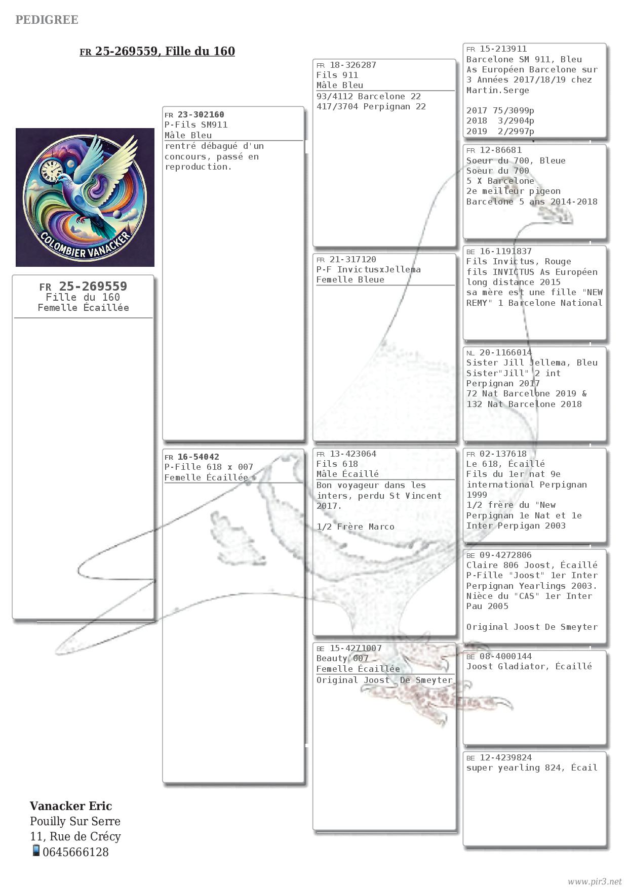 La mère est issue d’un croisement Vanacker x Joost De Smeyter. Plus exactement un demi-frere du Marco (618 x Claire, une de Smeyter) accouplé à une directe de chez Joost de la lignée du Gladiator
