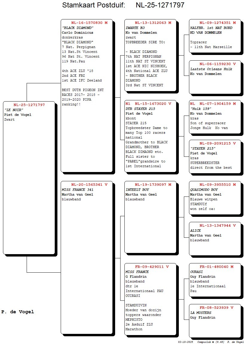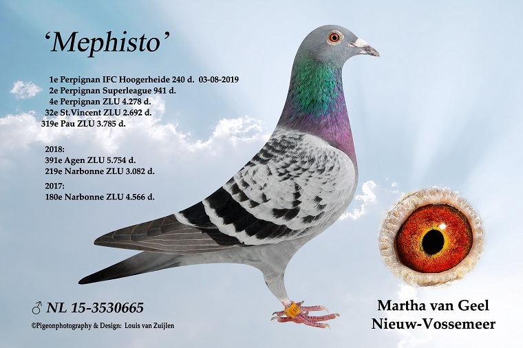 La mère du jeune présenté est une Martha Van Geel, une fille de Miss France, la super reproductrice de Martha. Miss France est la mère d’une brochette de bons pigeons dont Mephisto, 2e aspigeon ZLU. Miss France est une fille de Ourasi, vainqueur international de Pau de Guy Flandrin.
