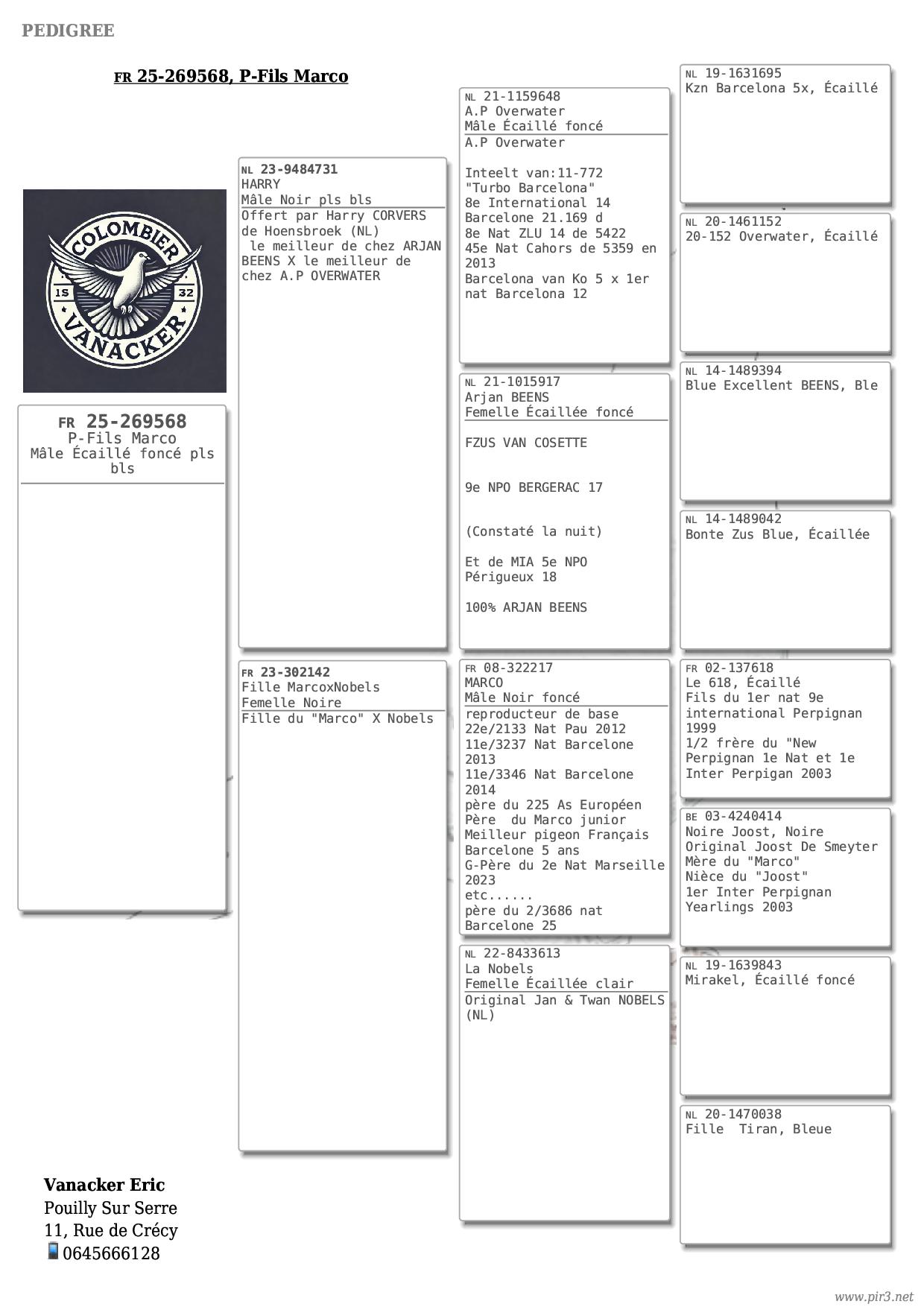 La mère est une fille de Marco l’un des pigeons emblématiques d’Eric. Extra voyageur (2 x11e nat de Barcelone + 22e nat de Pau) il s’est révélé par la suite être un géniteur hors norme. Il est le père du 225, as européen. Il est également le père du Marco junior, meilleur pigeon francais sur Barcelone sur 5 ans. Il est encore père du 2e national de Barcelone 2025. En seconde génération, il est par exemple le grand-père du 2e national Marseille.