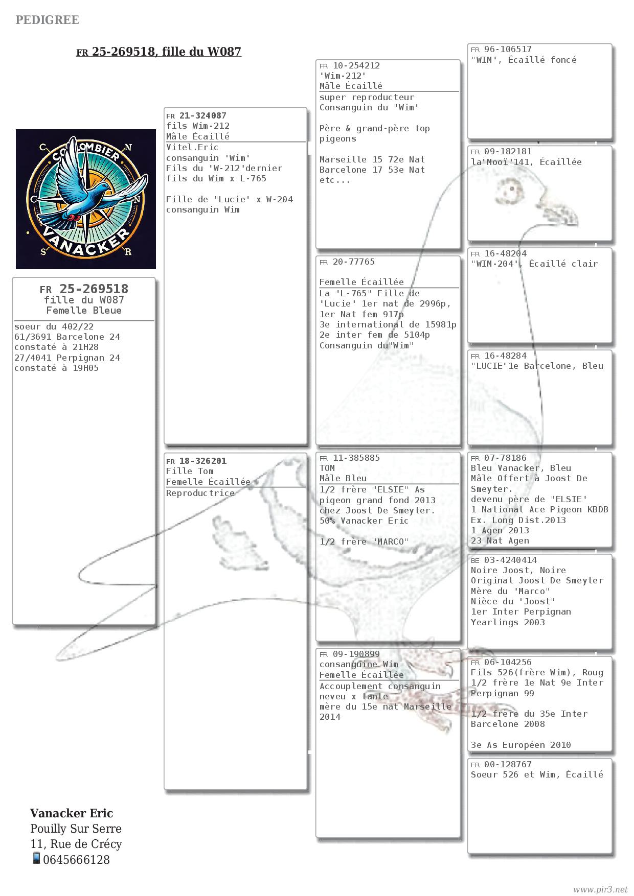 Le père est un direct Vitel, consanguin sur son fameux Wim. C’est un fils du Wim-212, le dernier fils du Wim sur une fille de Lucie accouplée avec le WIM-204. Lucie gagna le 1er national et le 2e international de Barcelone chez Eric.
