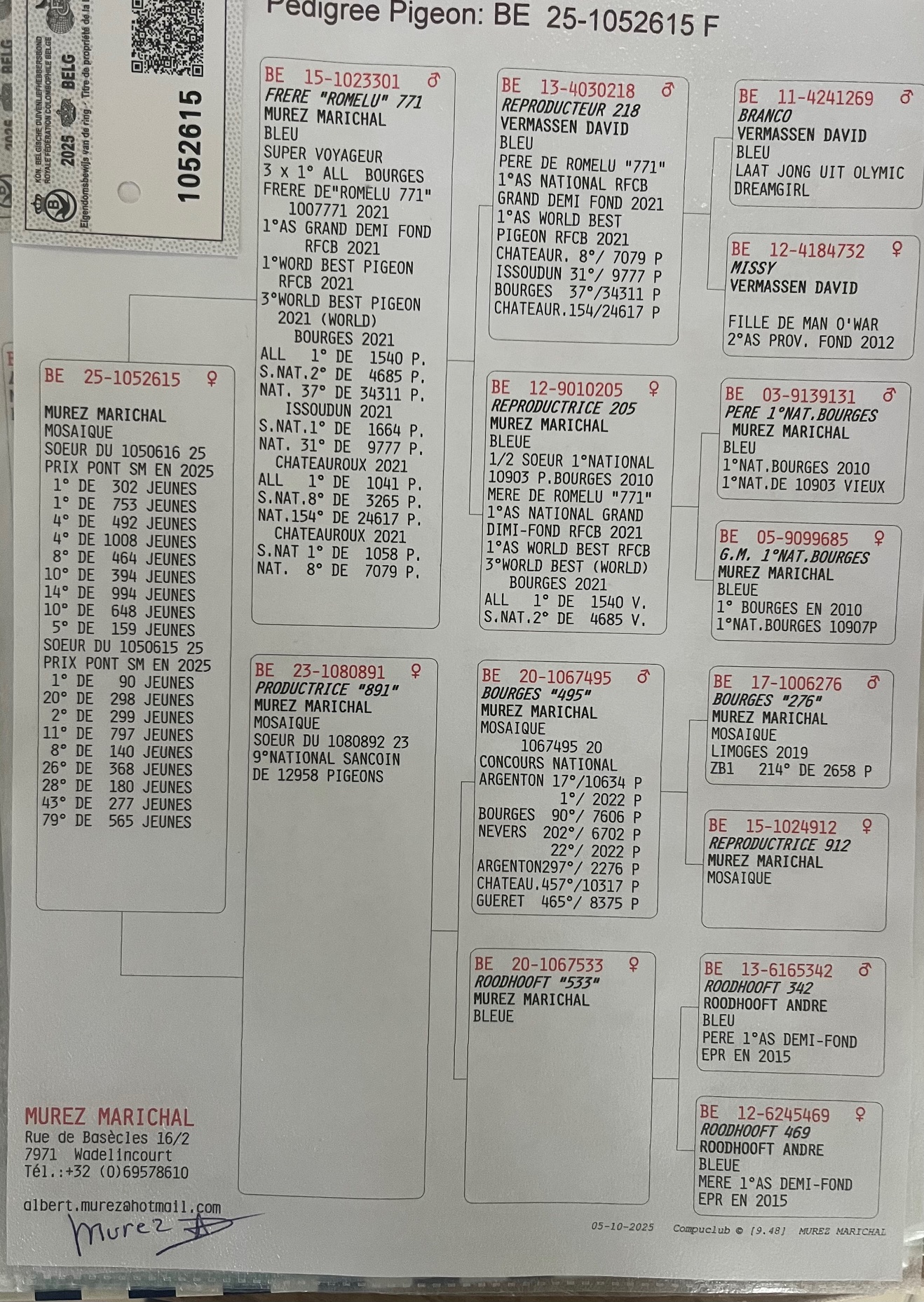 La mère est de la lignée du 1er national de Bourges. Son propre frère vole le 9ème national de Sancoins face à 12958 pigeons.