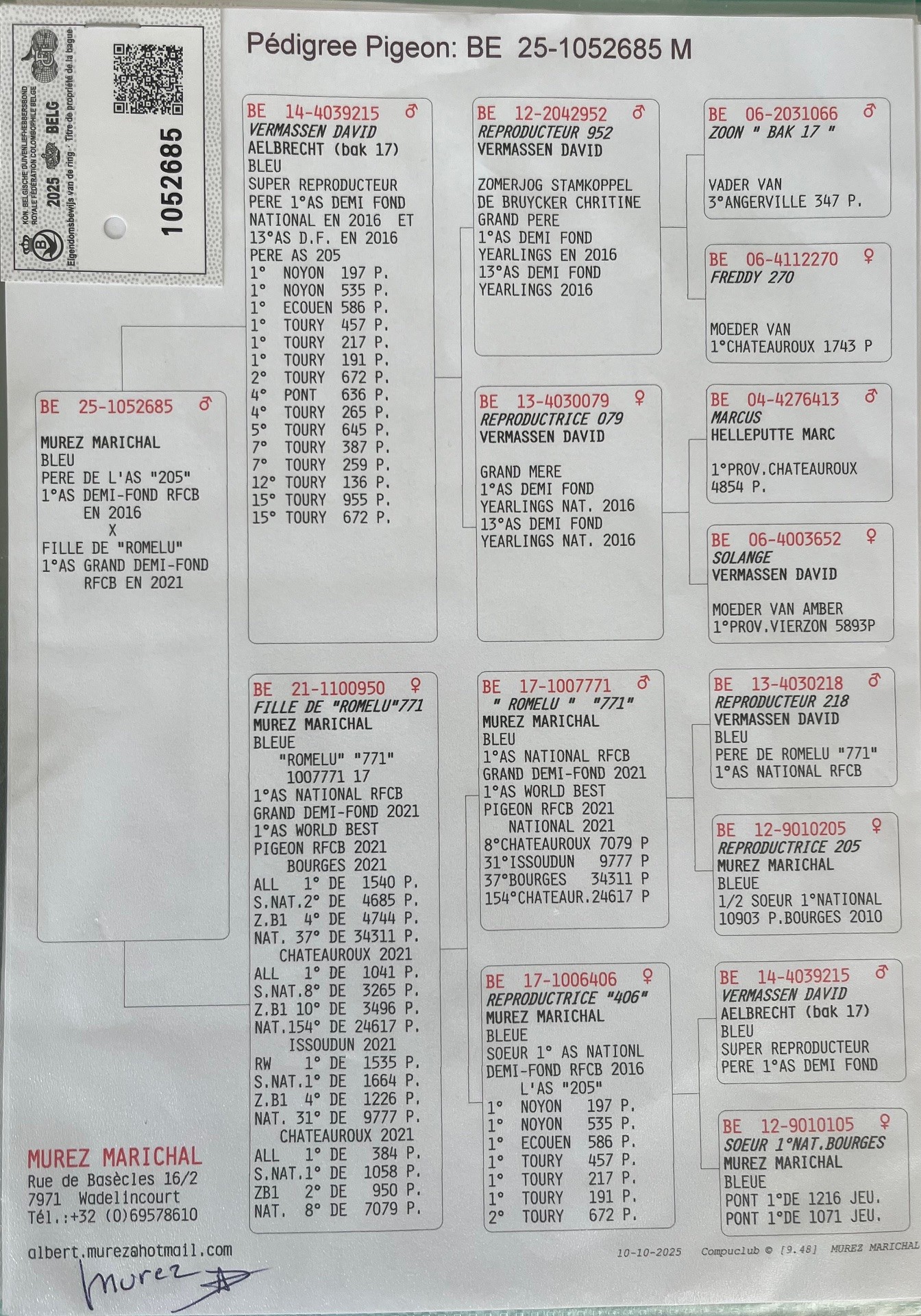 Le père est un pigeon de David Vermassen. Chez Albert, il a donné les 1er et 13ème as national demi-fond en 2016, les As 205 et 206. L’une des dernières chances d’acquérir un jeune d’un reproducteur + que confirmé.