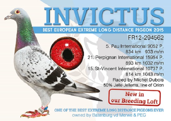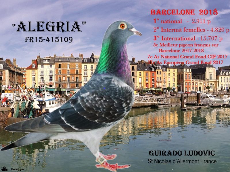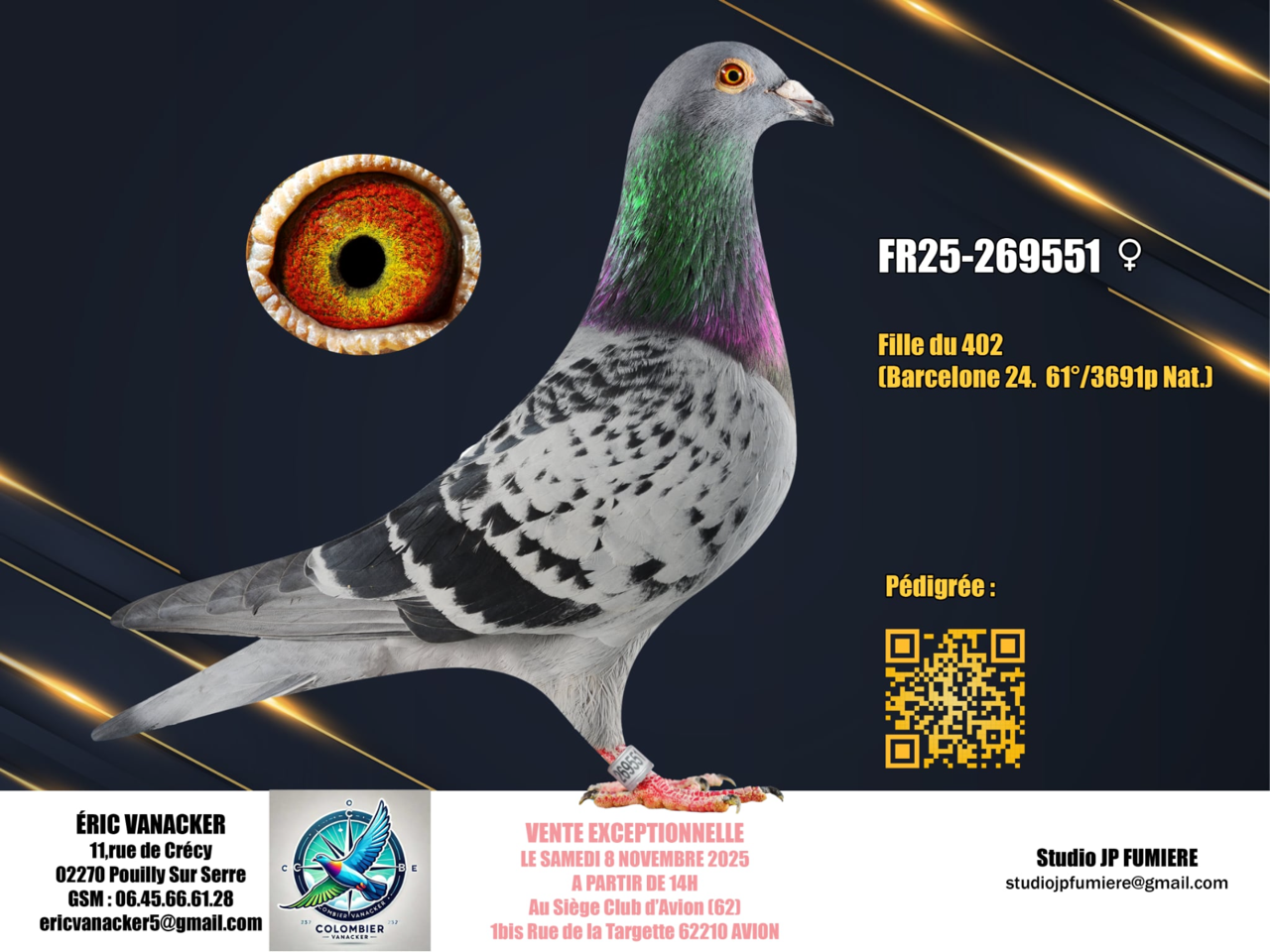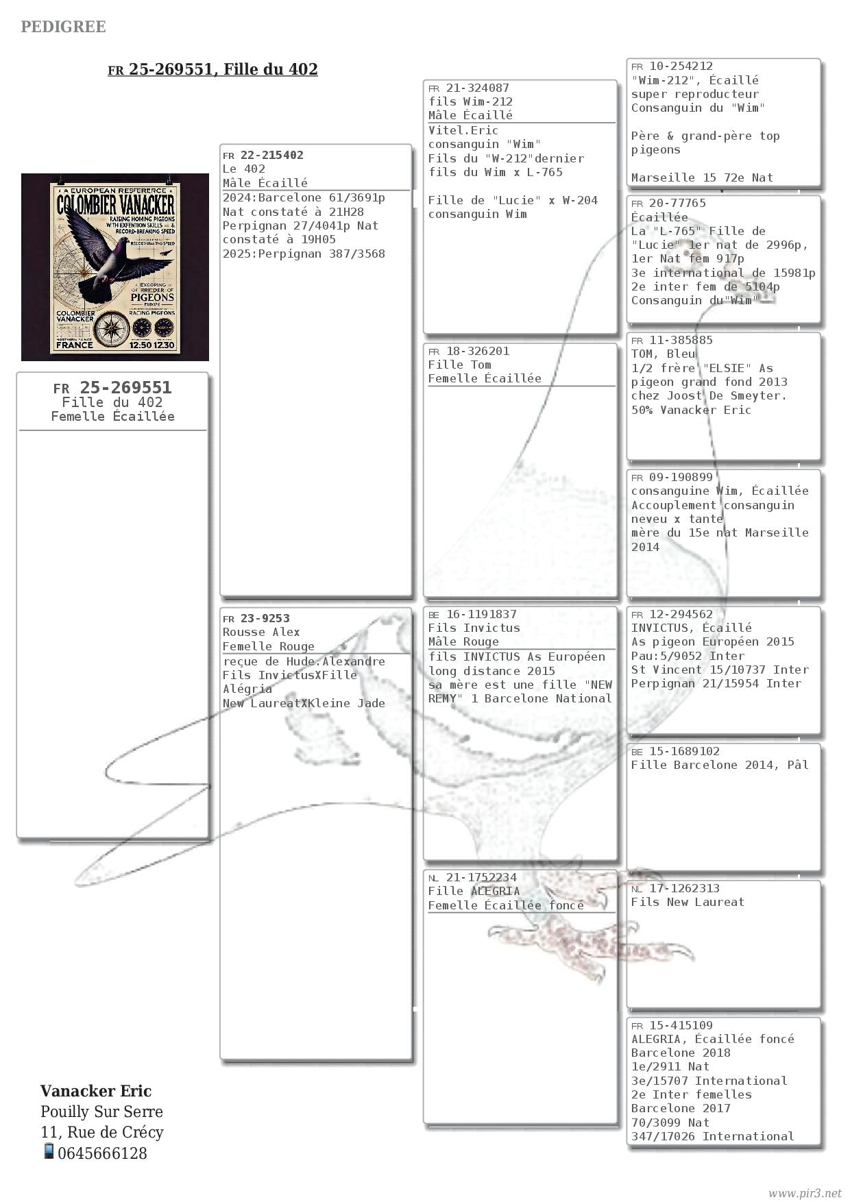 Le père est le 402 d’Eric, un des meilleurs pigeons de son équipe de jeu. En 2024, il vola les 27e national de Perpignan et 61e national de Barcelone. En 2025, il se classe de nouveau sur Perpignan. Le 402 est un 75% Eric Vittel (lignée Wim, Wim-212, Lucie) et 25% Joost de Smeyter avec Tom un demi-frère de Elsie une as pigeon grand-fond en 2013.