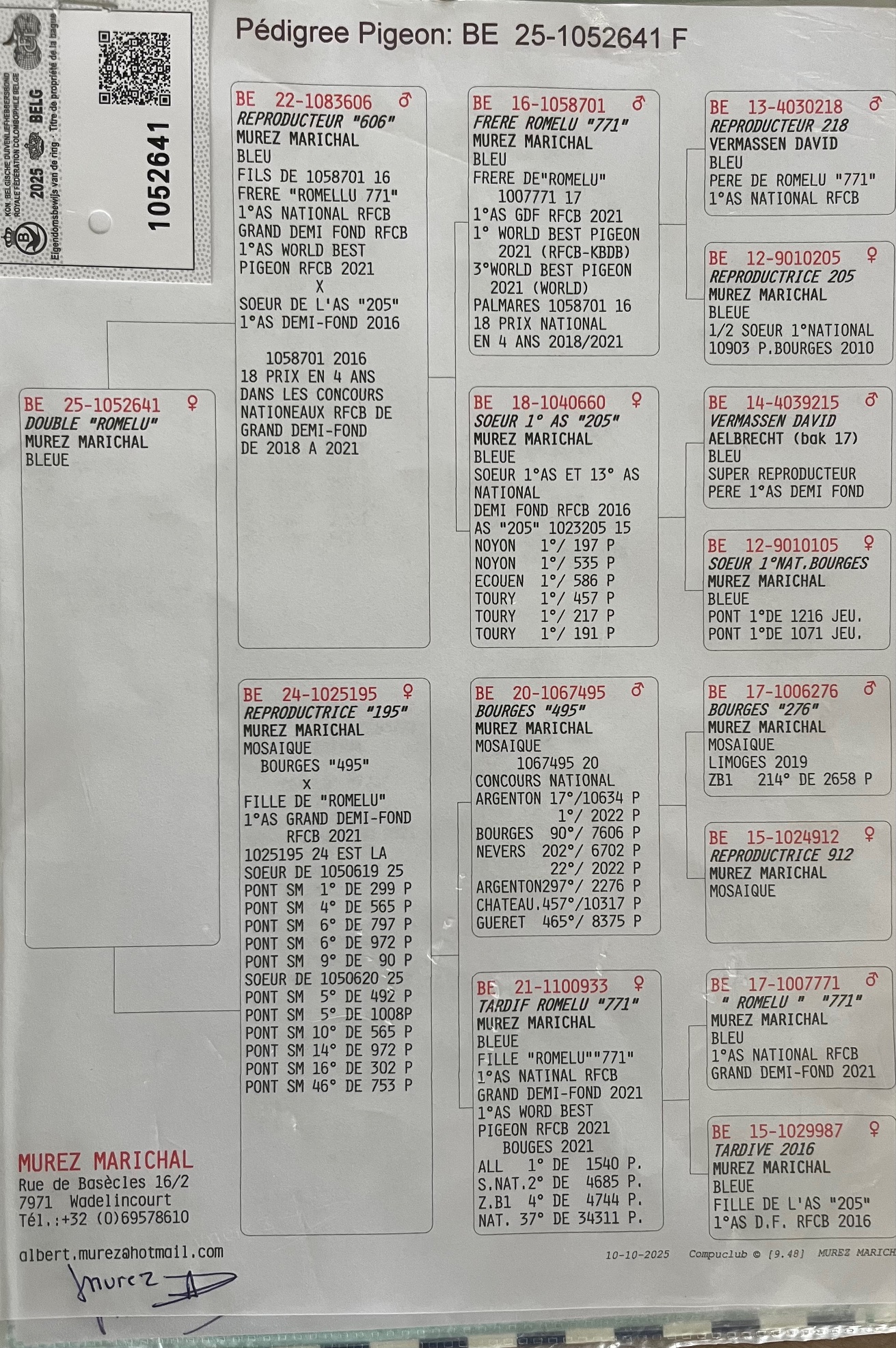 La mère est une fille du Bourges 495, 17e national de 10634 pigeons sur Argenton et de la lignée des Bourges accouplé à une fille de Romelu sur une fille l’As 205.