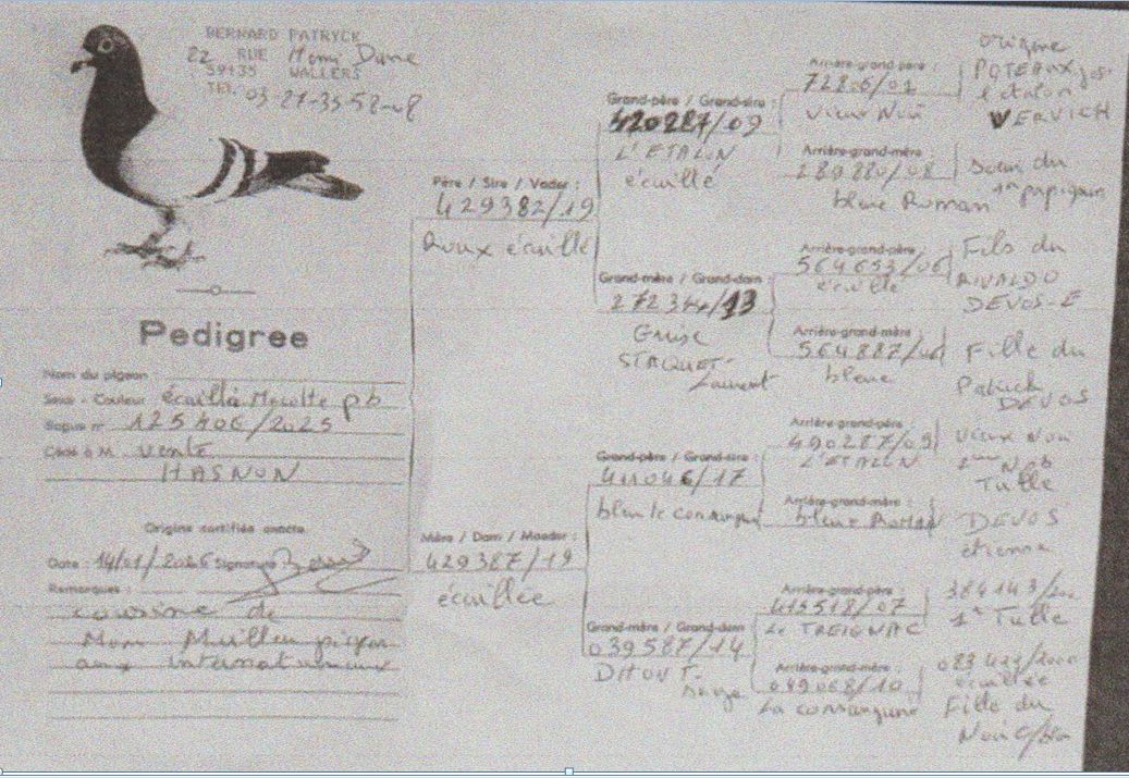 Offre 1 pigeon voir pedigree ci-dessous :