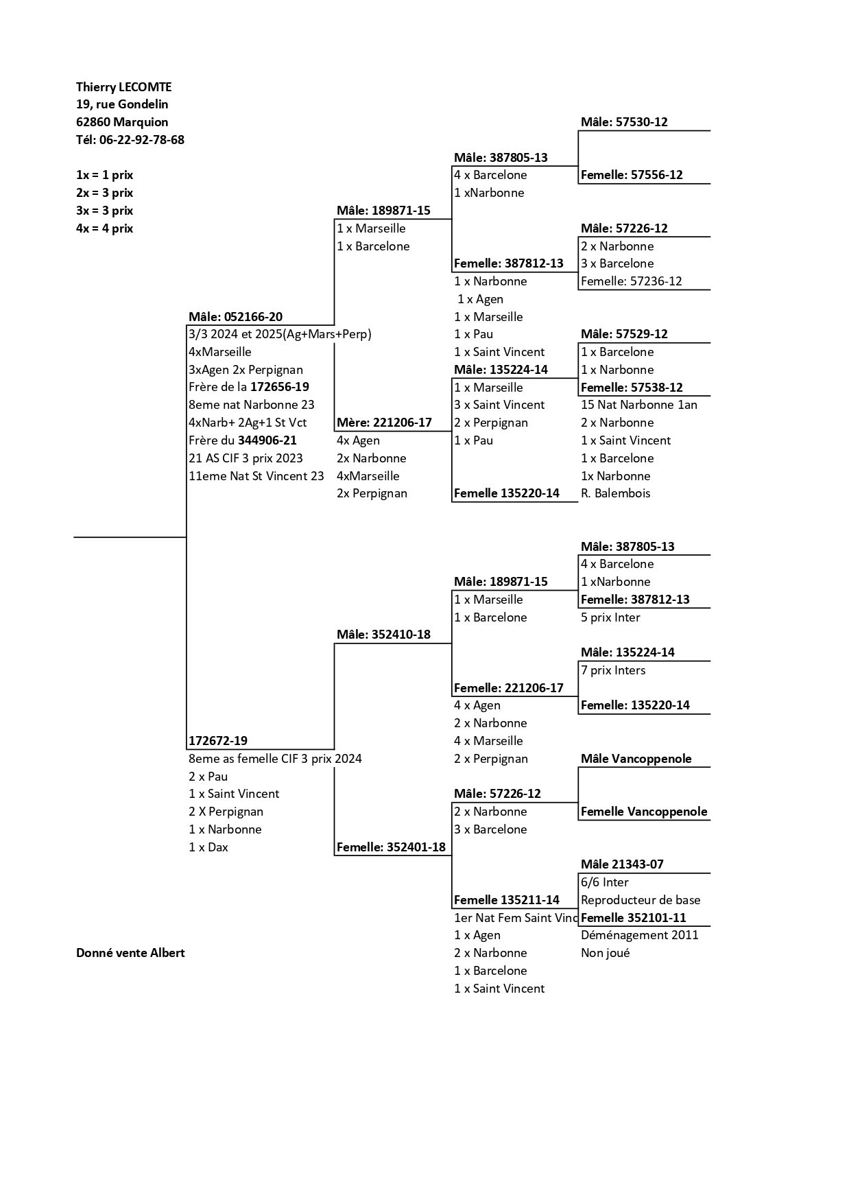 La colonie Thierry Lecomte illustre parfaitement ce que recherchent les amateurs de grand fond et d’internationaux : régularité, compétitivité et capacité à performer chaque année au plus haut niveau, que ce soit avec les vieux, les yearlings ou les femelles.