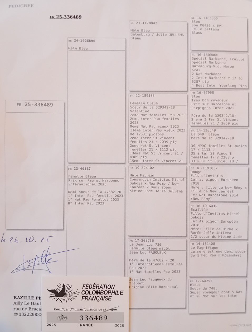 Offre un jeune 2025 (voir pédigrée, le pigeon se trouve dans les Ardennes)