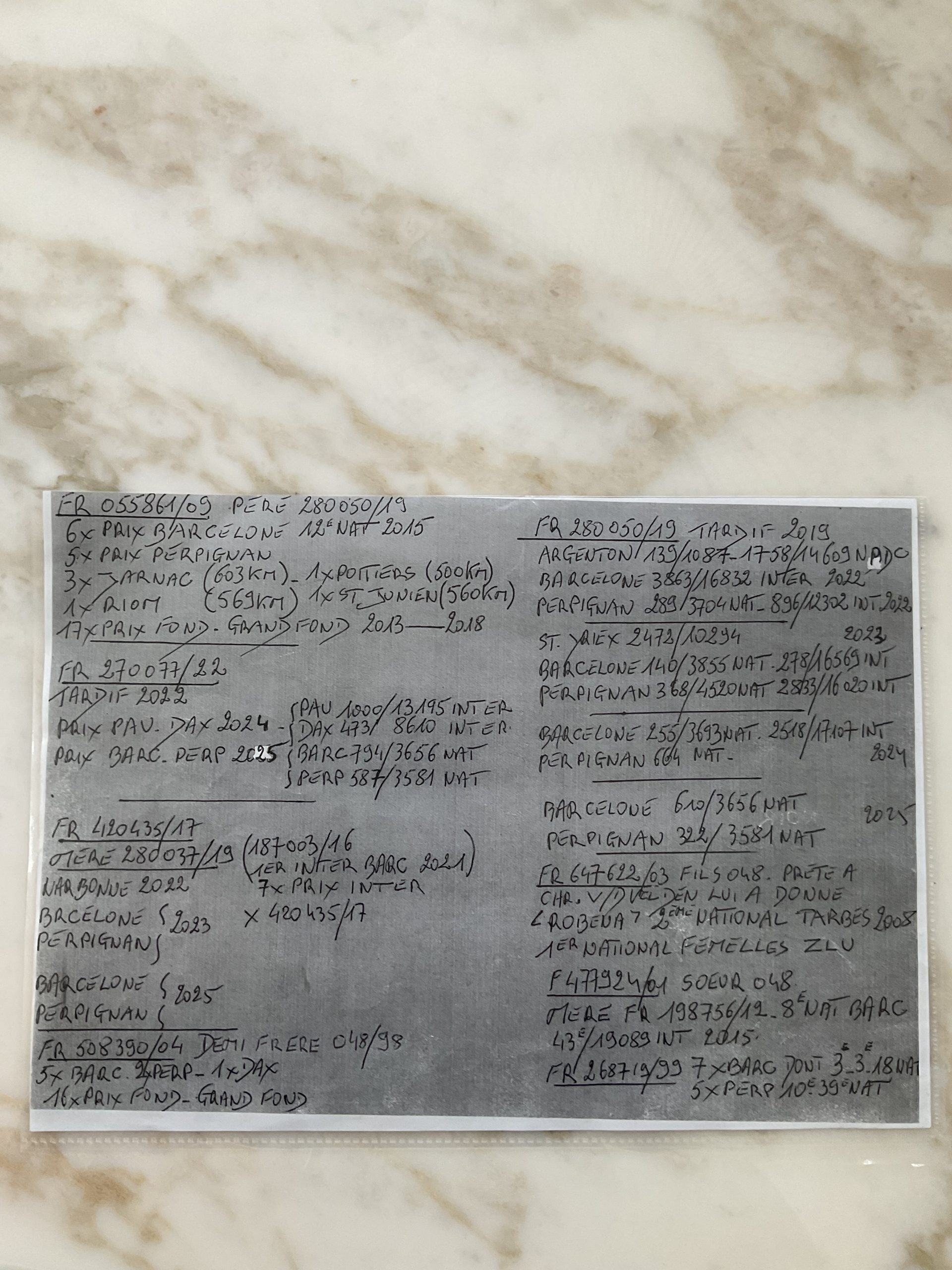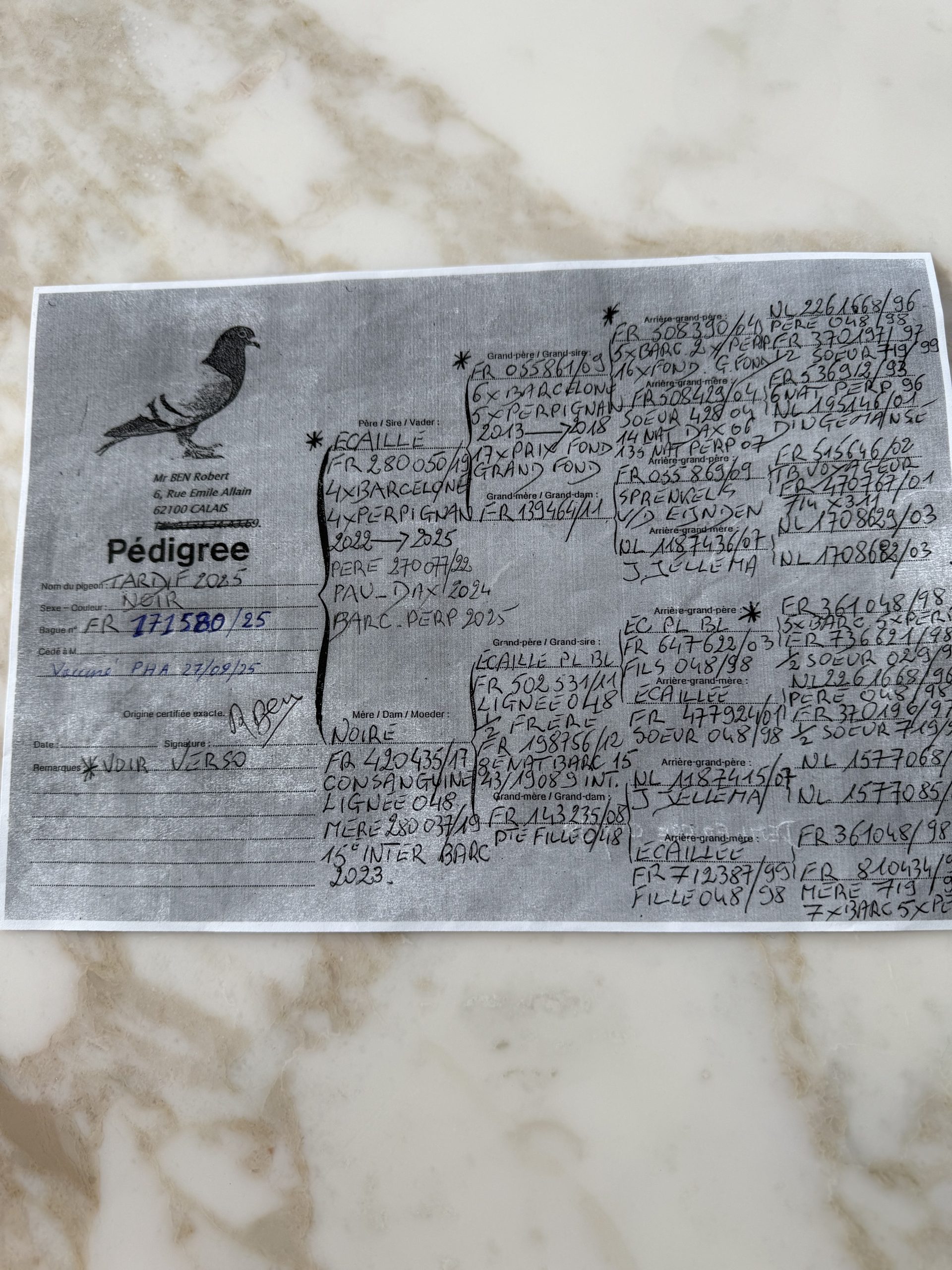 Le père ,sûrement un des deux meilleurs pigeons de Robert puisqu’il est toujours le premier ou deuxième marqué, le 280050/19 a à son actif quatre doublés BARCELONE /PERPIGNAN.Il est le géniteur du 270077/22 avec déjà un beau palmarès :2024 PAU/DAX et en 2025