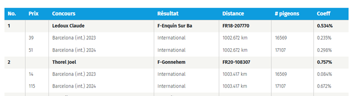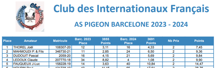 - Barcelone : 2 pigeons en 3’’, 3/5 NPC, 3/5 Nat, 3/5 Int 17107 p.
