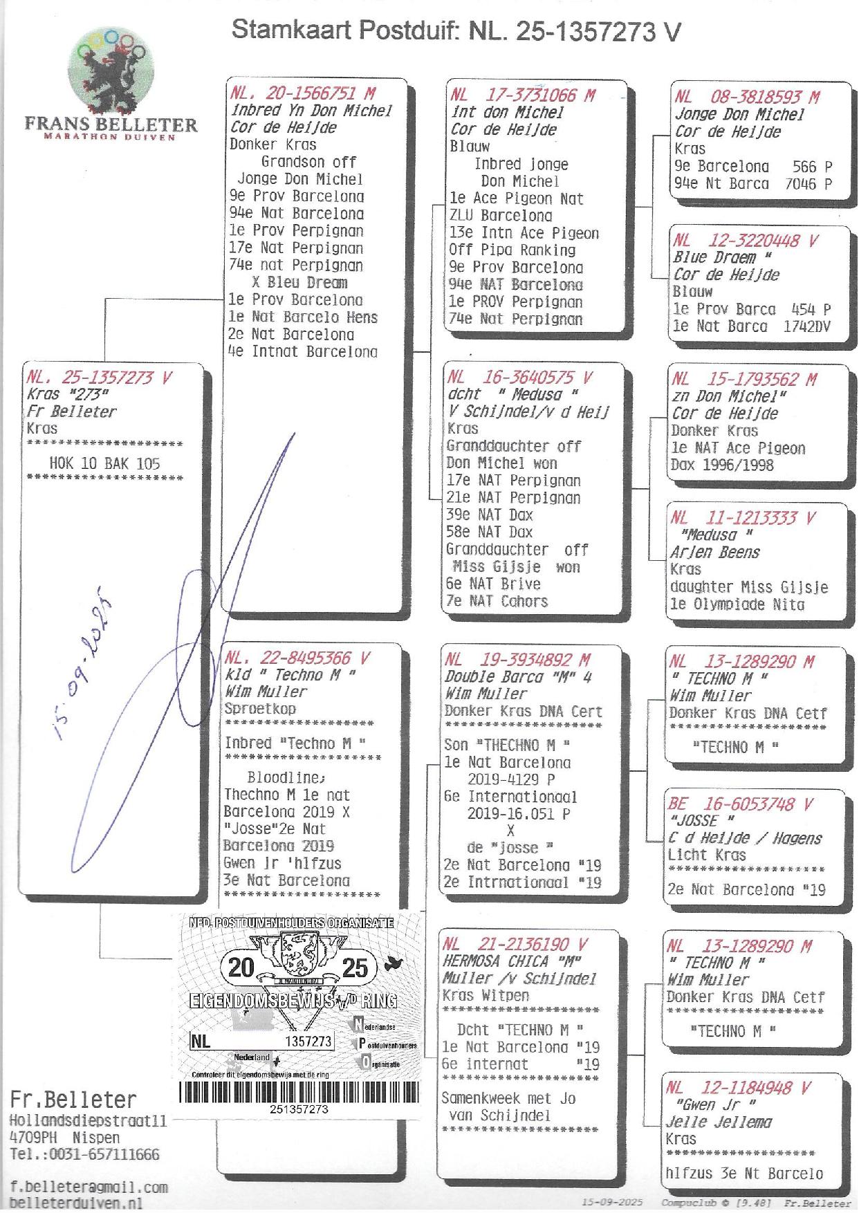 On retrouve à chaque étage du pédigrée du père ce reproducteur et voyageur exceptionnel, avec juste une pointe de sang Arjan Beens apporté par la MEDUSA (lignée MISS GIJSJE!)