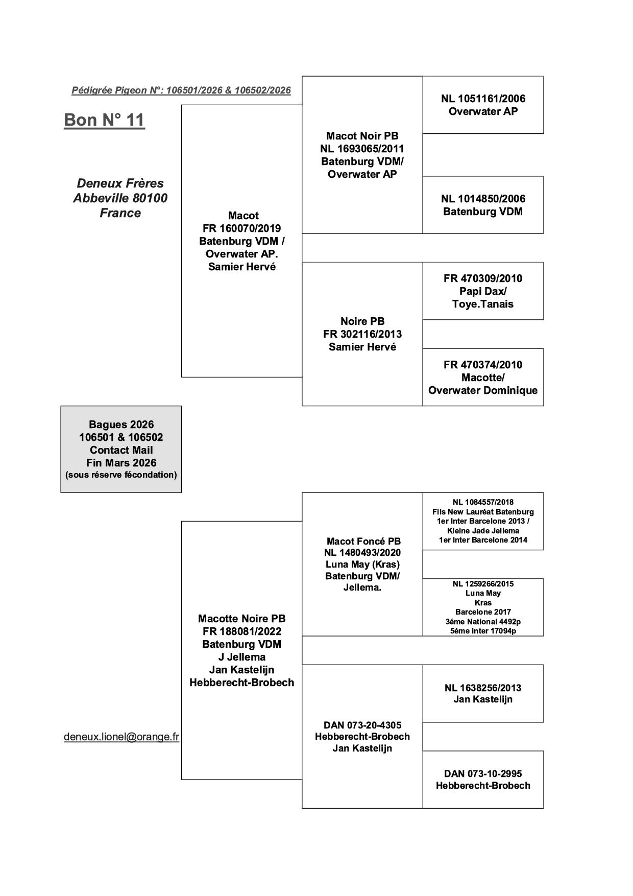 Offre 2 pigeonneaux (Contact Fin Mars) Voir pédigrée joint (descendance des 1ers inter Barcelone 2013,2014 et 5éme 2017)