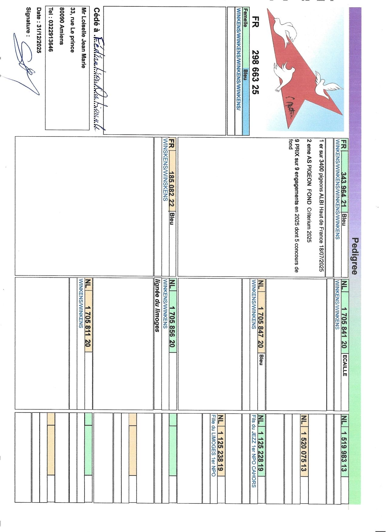remportant Albi Hauts-de-France, un concours national. Il s’impose dans quelque 3400 pigeons avec le 343964-2021, 9 prix de 9 engagements en 2025 et as pigeon national sur le critérium fond de la FCF ! Un pigeon hors du commun avec les origines Winkens.