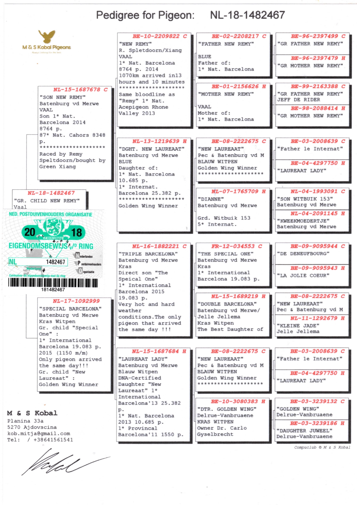 Mâle Meunier 1482467-2018 un M&S KOBAL Petit fils du New REMY 1er Nat Barcelone 2014 et du New Laureat Batenburg 1er International de Barcelone par le père. La mère est une petite fille de Spécial One 1er International de Barcelone 2015 mais aussi consanguine du New Laureat.