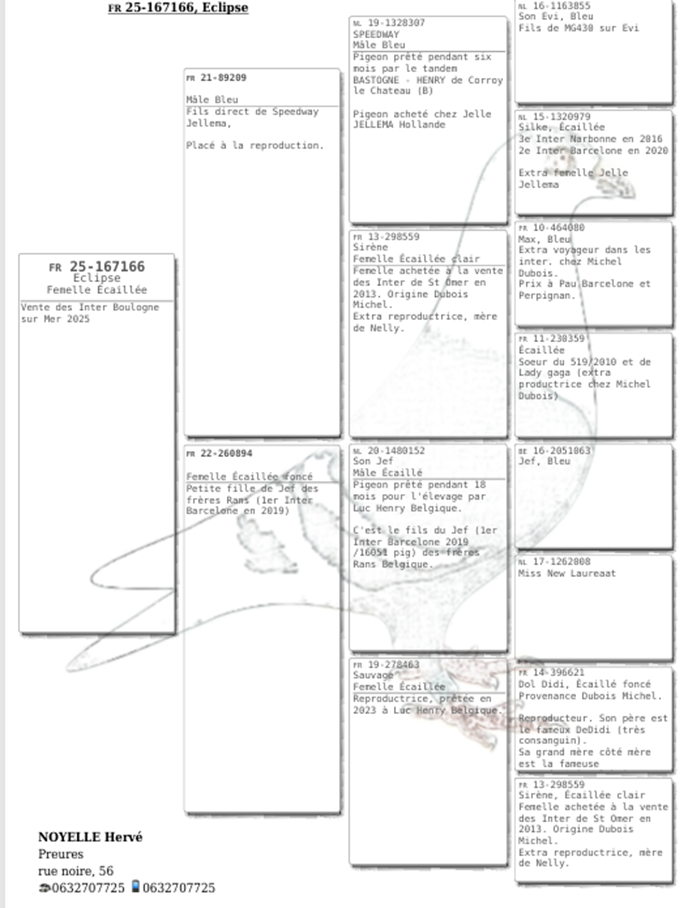 Un cadeau royal un jeune du JELLEMA (SILKE/MG430) par le père, avec les vielles lignées de DUBOIS Michel et par la mère du JEF / NEW LAUREAT sur encore les vielles lignées DUBOIS Michel