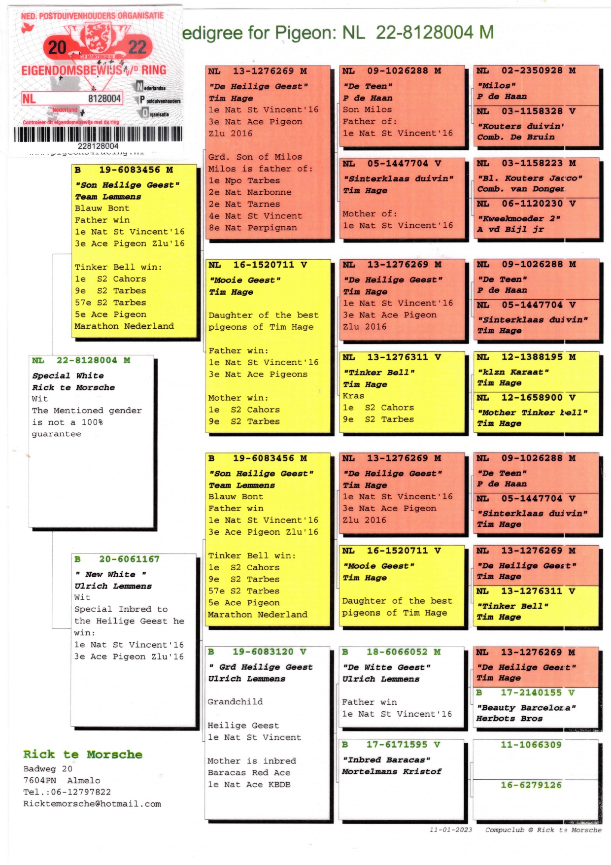 Mâle Blanc 8128004-22 un spécial White de Rick te Morsche. Le père est un Lemmens, un fils du 1er Nat St Vincent 2016 accouplé à sa petite fille déjà consanguine du St Vincent.
