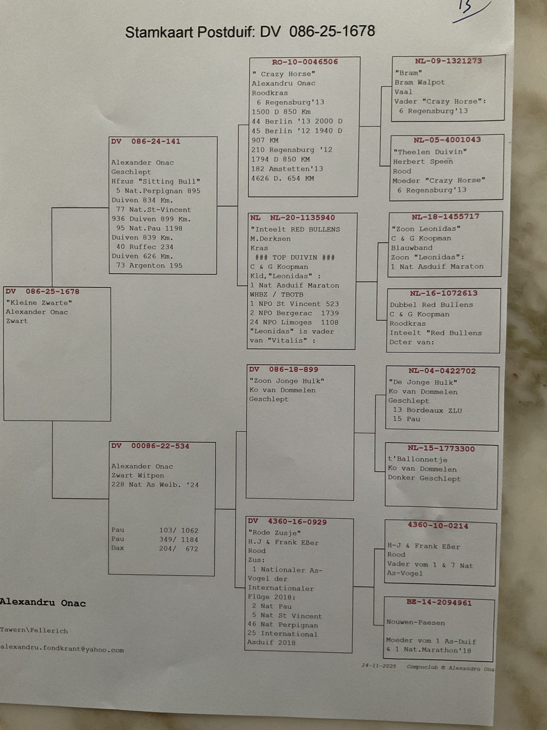 Alexander grand ami de Ko van DOMMELEN chez qui il a obtenu le meilleur, nous offre une jolie femelle qui a du sang du Jonge Hulk un pilier chez KO. Le frère du père est Sitting Bull meilleur pigeon d’Alexander :5e National Perpignan,77e National St Vincent,95 e National Pau ….