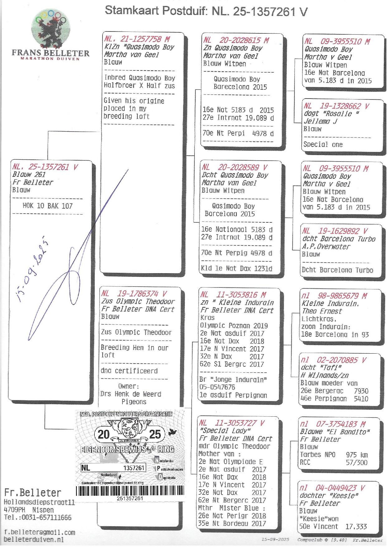 Le père du jeune n’est autre qu’un double petit fils du légendaire QUASIMODO BOY, pierre angulaire de l’élevage VAN GEEL, renforcé par le sang d’une fille de la ROSALIE JELLEMA et d’une fille du BARCELONA TURBO OVERWATER.