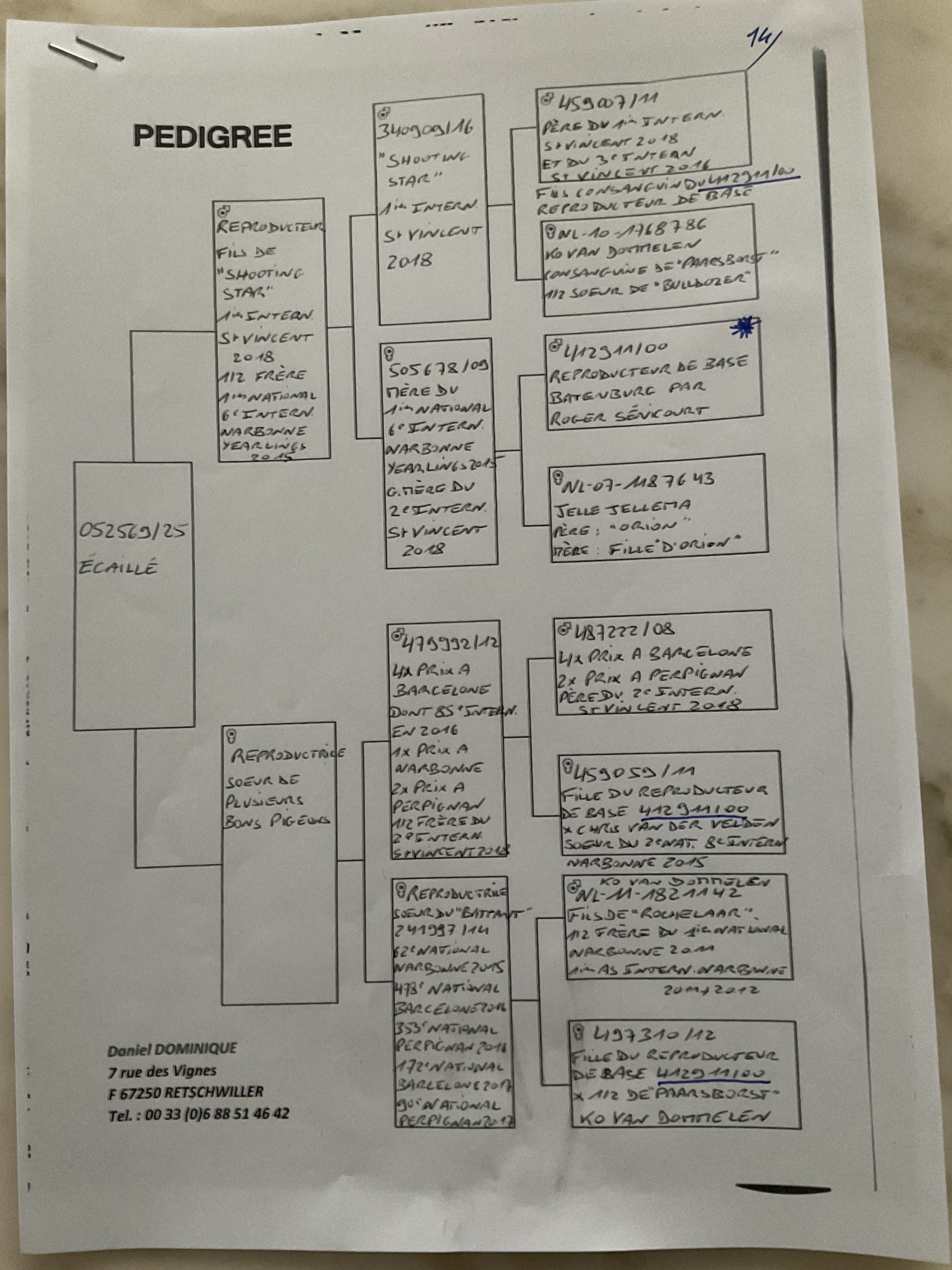 Daniel se remet du vol de ses reproducteurs en 2018,il nous propose un superbe petit fils de SHOOTING STAR 1e International St Vincent 2018,résultat d’un travail en consanguinité éloignée sur le reproducteur de base le 412911-00,un Batenburg par Roger Senicourt croisé avec le top de chez Ko van Dommelen,le Paarsborst et le Rochelaar.