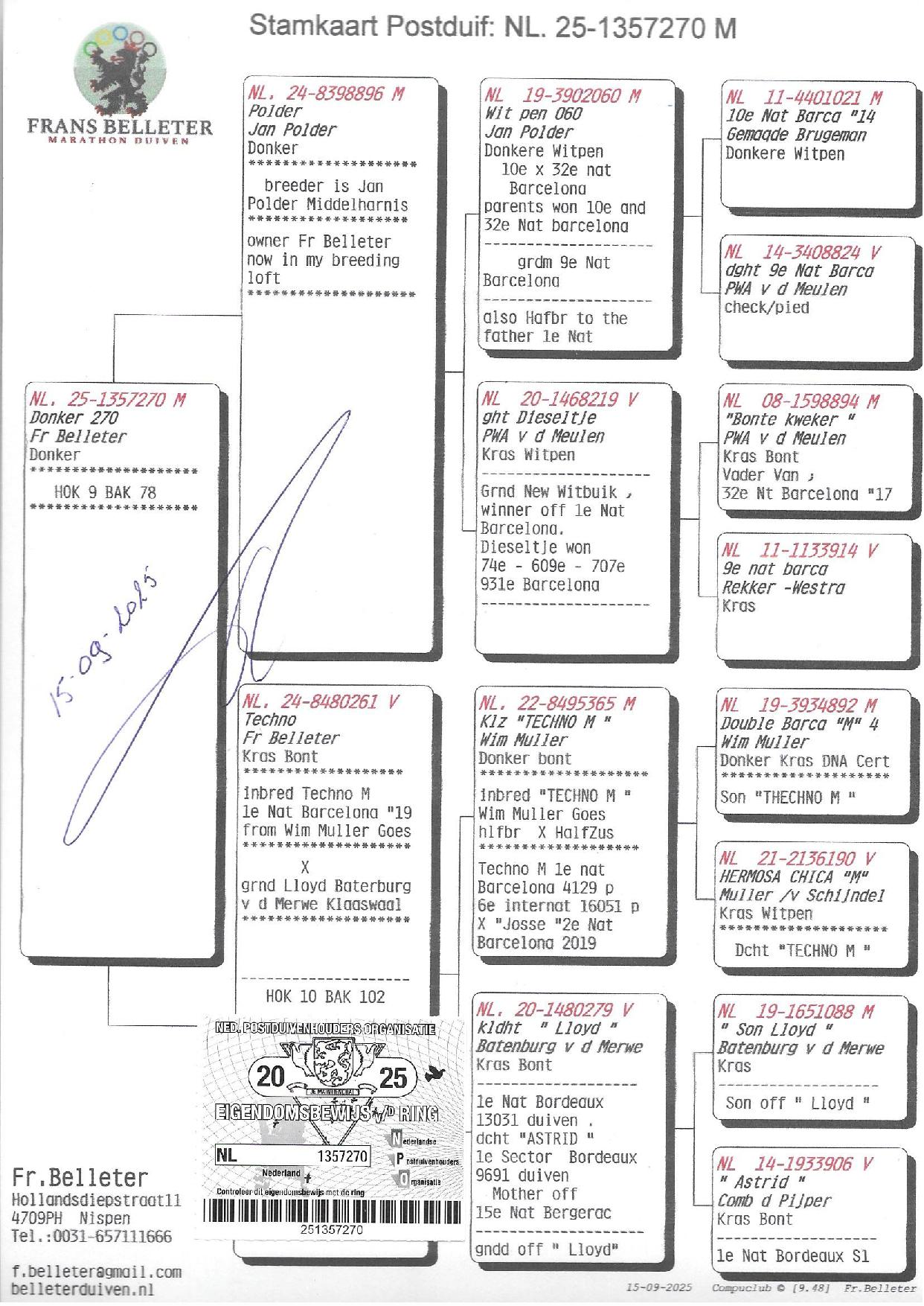 Rappelons que le TECHNO M est 1er NATIONAL HOLLANDE sur BARCELONE 2019, et 6ème International sur plus de 16000 pigeons.