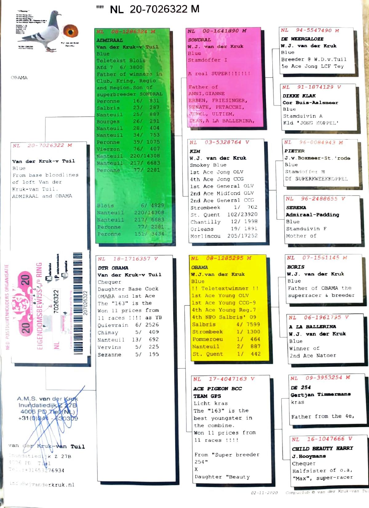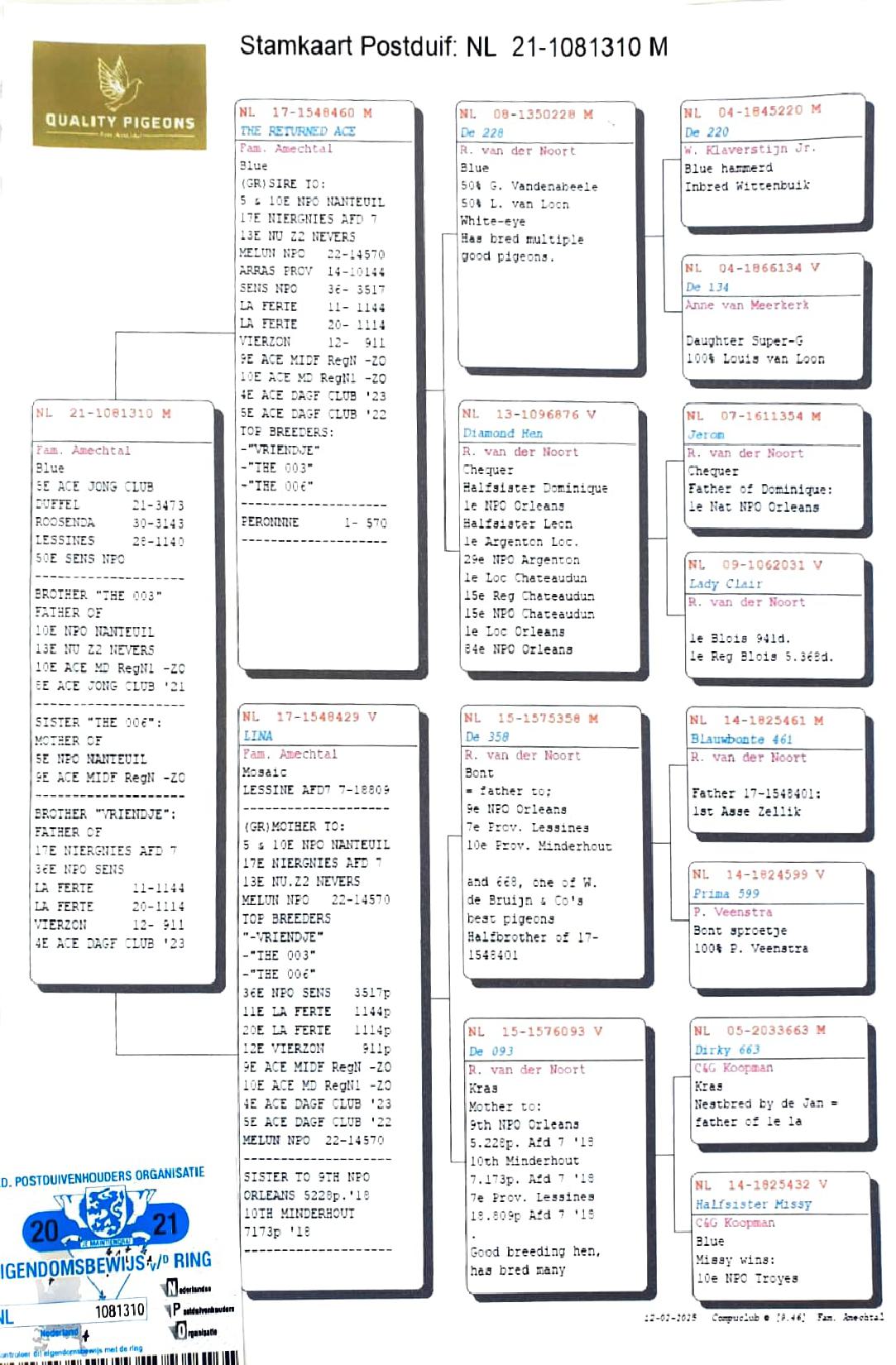 Offre un pigeonneau 2026 avec une belle origine pour la vitesse et demi fond voir pédigrées ci dessous