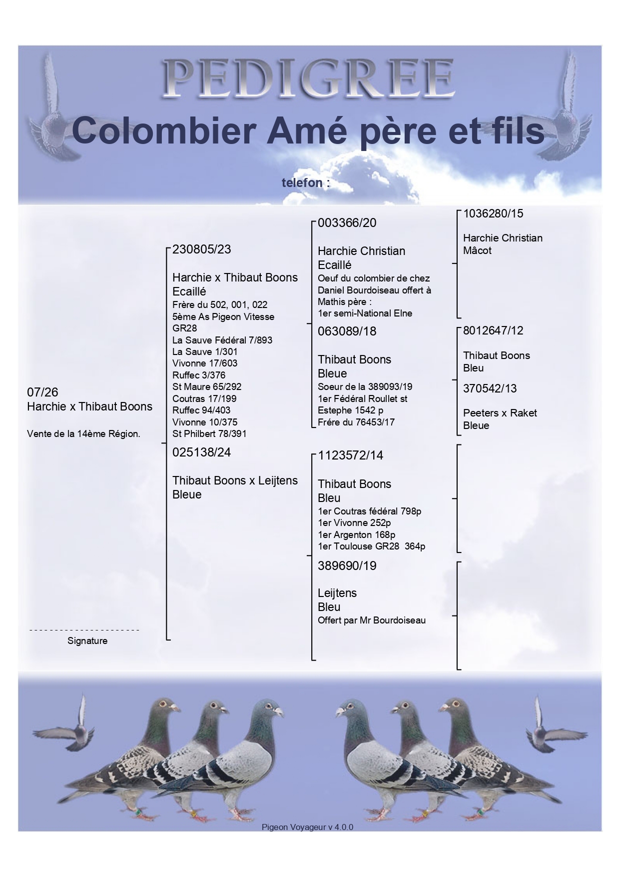 Offrent un pigeonneau 2026 (voir pedigree ci-dessous).