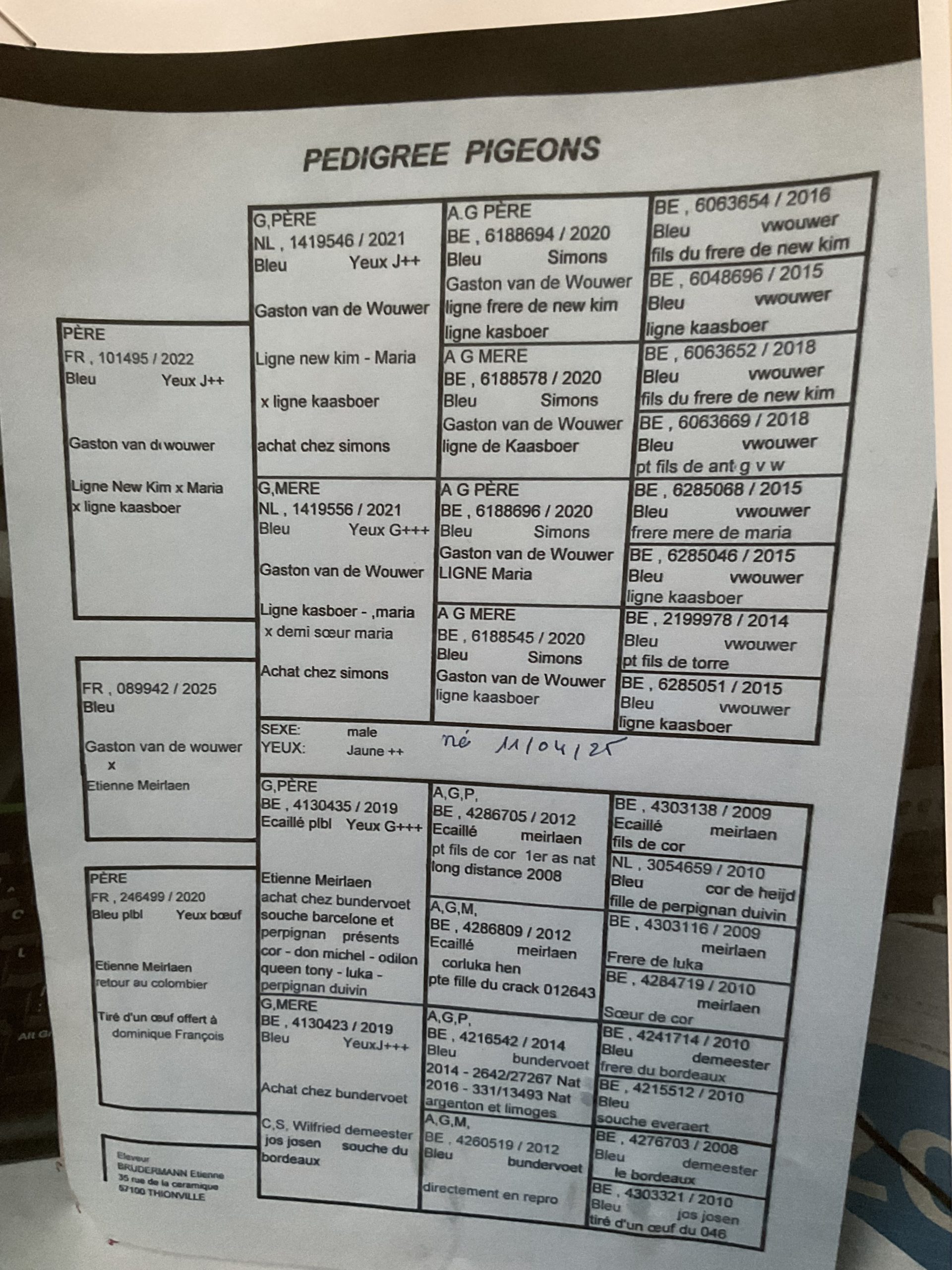 Le mâle qu’il nous offre est un concentré de ce qu’il a de mieux : ses fameux Gaston van de Wouwer croisés sur ses Meirlaen qui ont donnés des pigeons All Round.