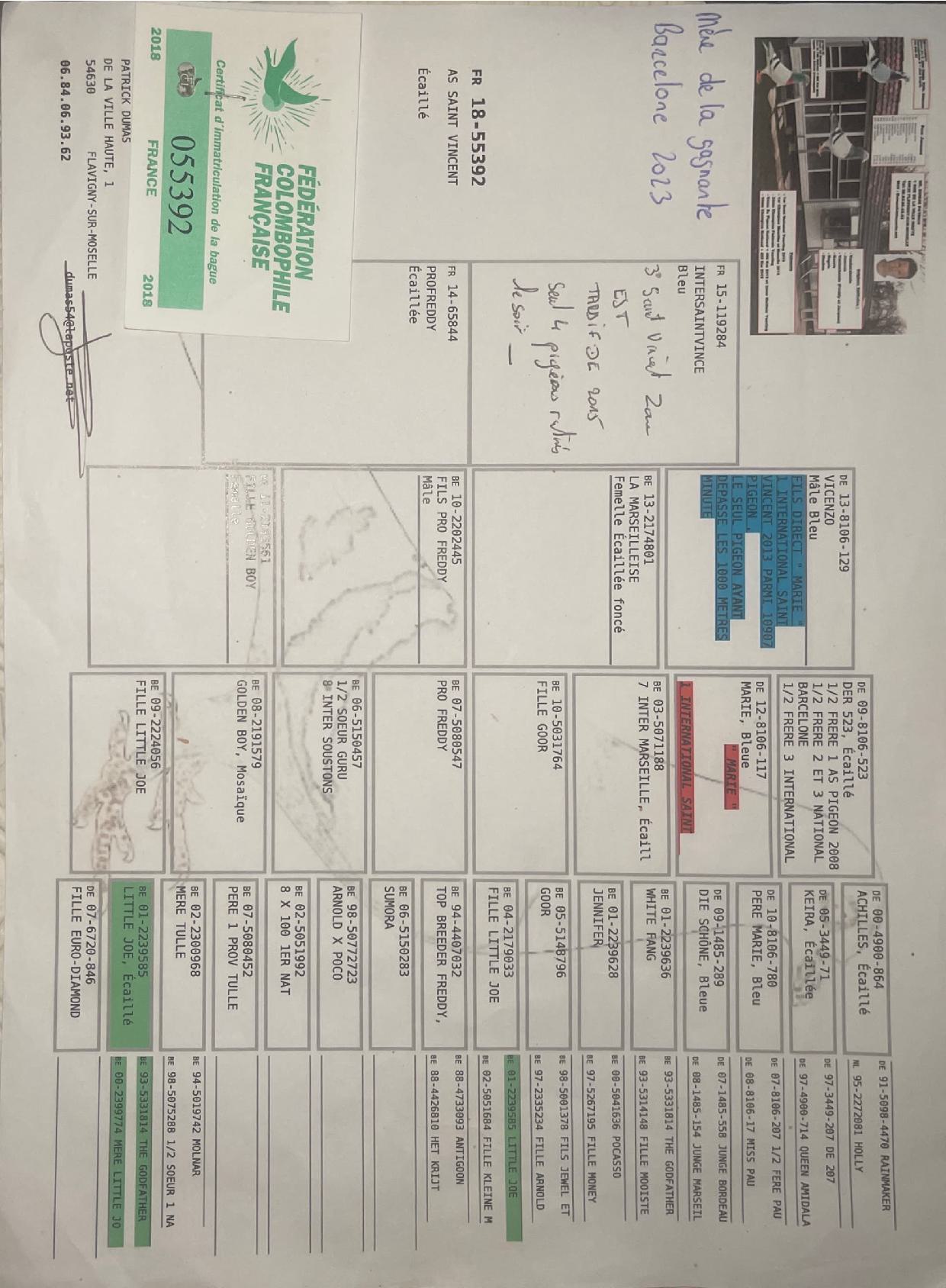 Fait partie du cercle fermé des amateurs français ayant réussi l’exploit de remporter le 1er International et national au concours mythique de BARCELONNE en 2023 sur 16561 pigeons..