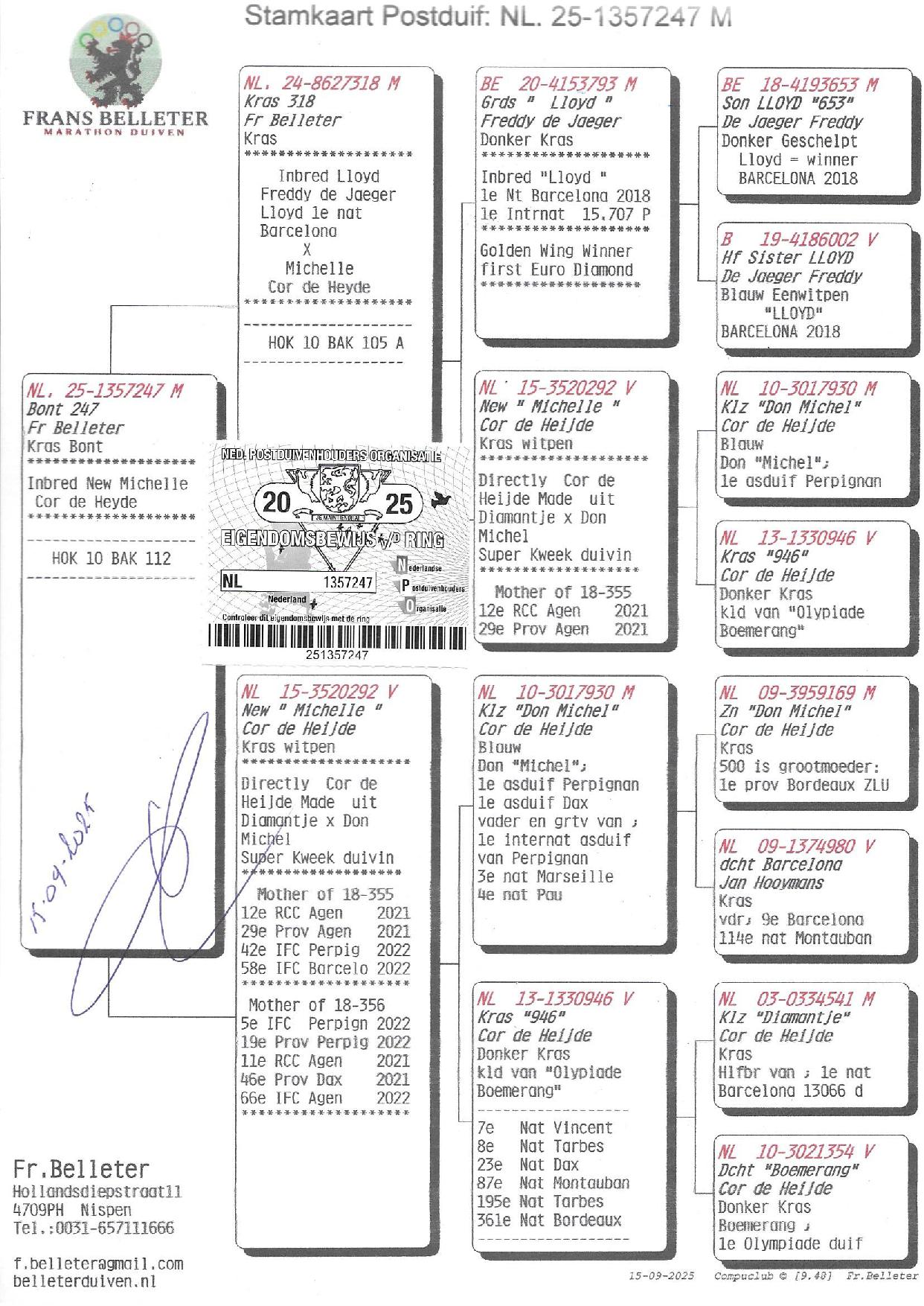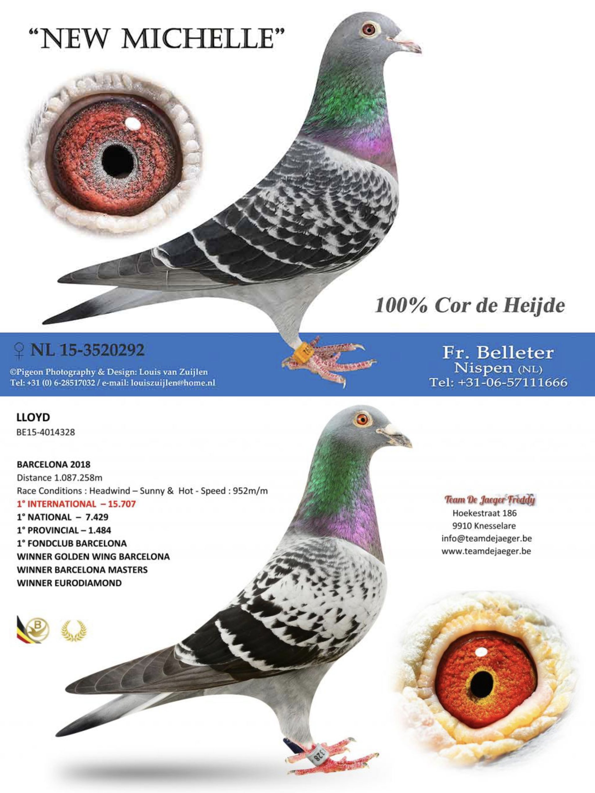 La mère est du pigeonneau est tout simplement cette même NEW MICHELLE, ce qui nous donne au final un jeune hyper consanguin sur le meilleur de chez COR DE HEIJDE, épaulé par le noble sang du LLOYD, 1er international BARCELONE 2018.