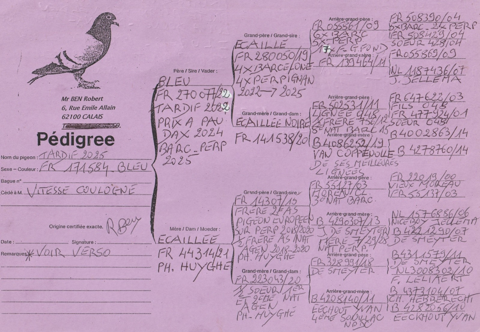 Le grand père est un frère du 2eme As pigeon européen sur Perpignan 2018/20 chez Philippe huyghe. Le tout descendant des meilleures origines de J De Smeyter