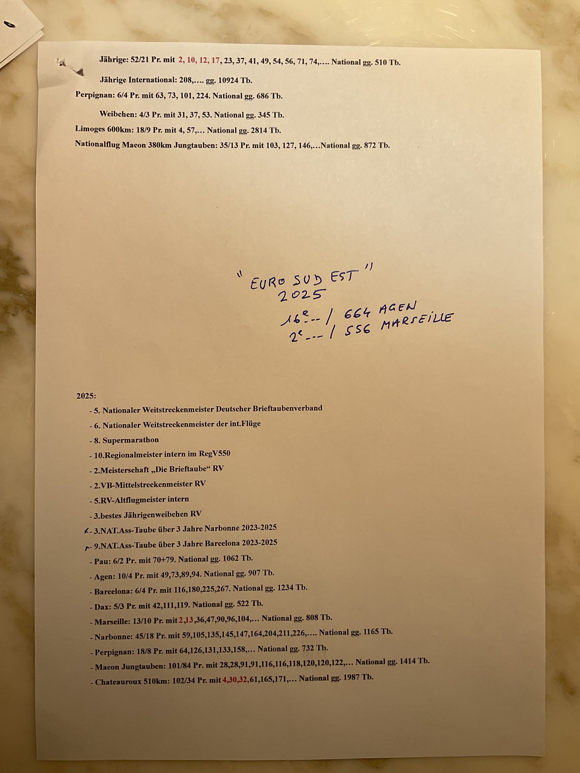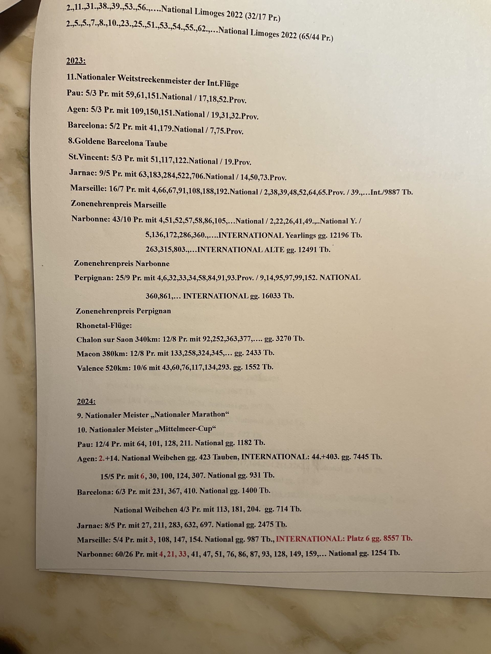 Torsten est un amateur régulier dans ses résultats ,cette année il termine 6e au classement des concours internationaux,8e au Supermarathon,3e As pigeon National sur Narbonne 3 ans,9e As pigeon National sur Barcelone 3 ans.