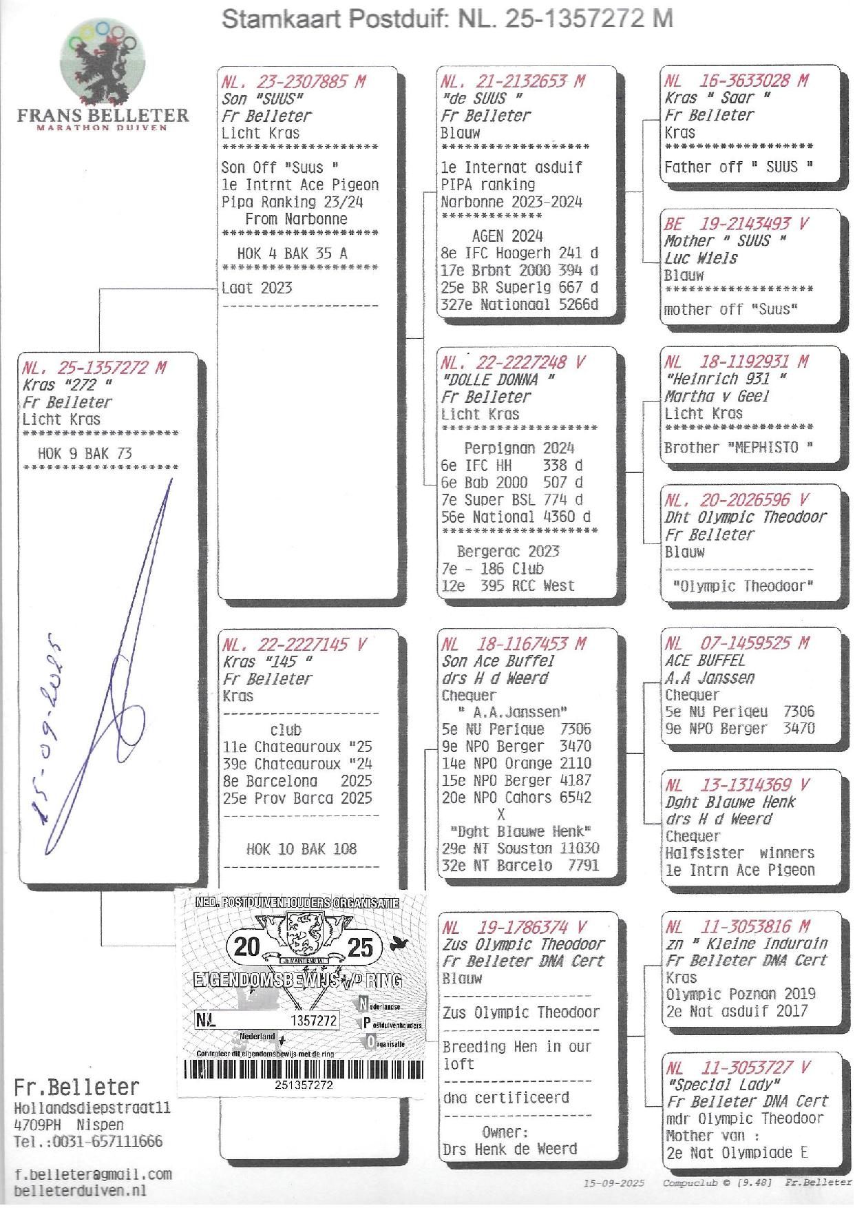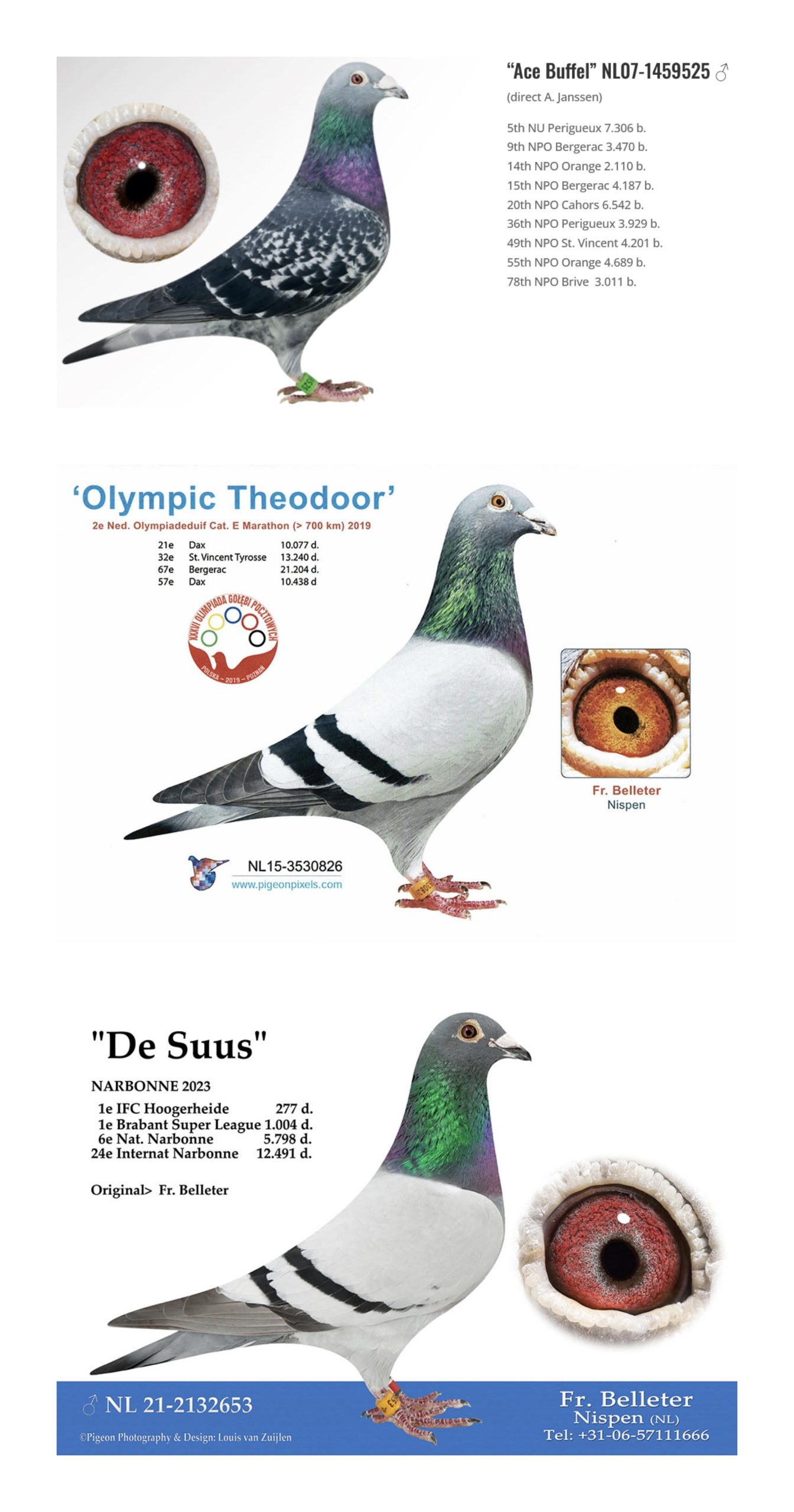 Pas surprenant quand on étudie le pedigree où l’on retrouve deux origines de légende : la colonie DE WEERD avec un fils de l’ACE BUFFEL (9ème et 15ème NATIONAL BERGERAC, 14ème NATIONAL ORANGE, 20ème NATIONAL CAHORS, 5ème PERIGUEUX, etc) marié au sang de la lignée du top voyageur BELLETER OLYMPIC THEODOOR, qui a été primé aux olympiades à Poznan 2019, mais a également remporté le 2e as pigeon national 2017, 16ème national DAX 2018, 32ème national DAX et 62ème national Bergerac 2017.