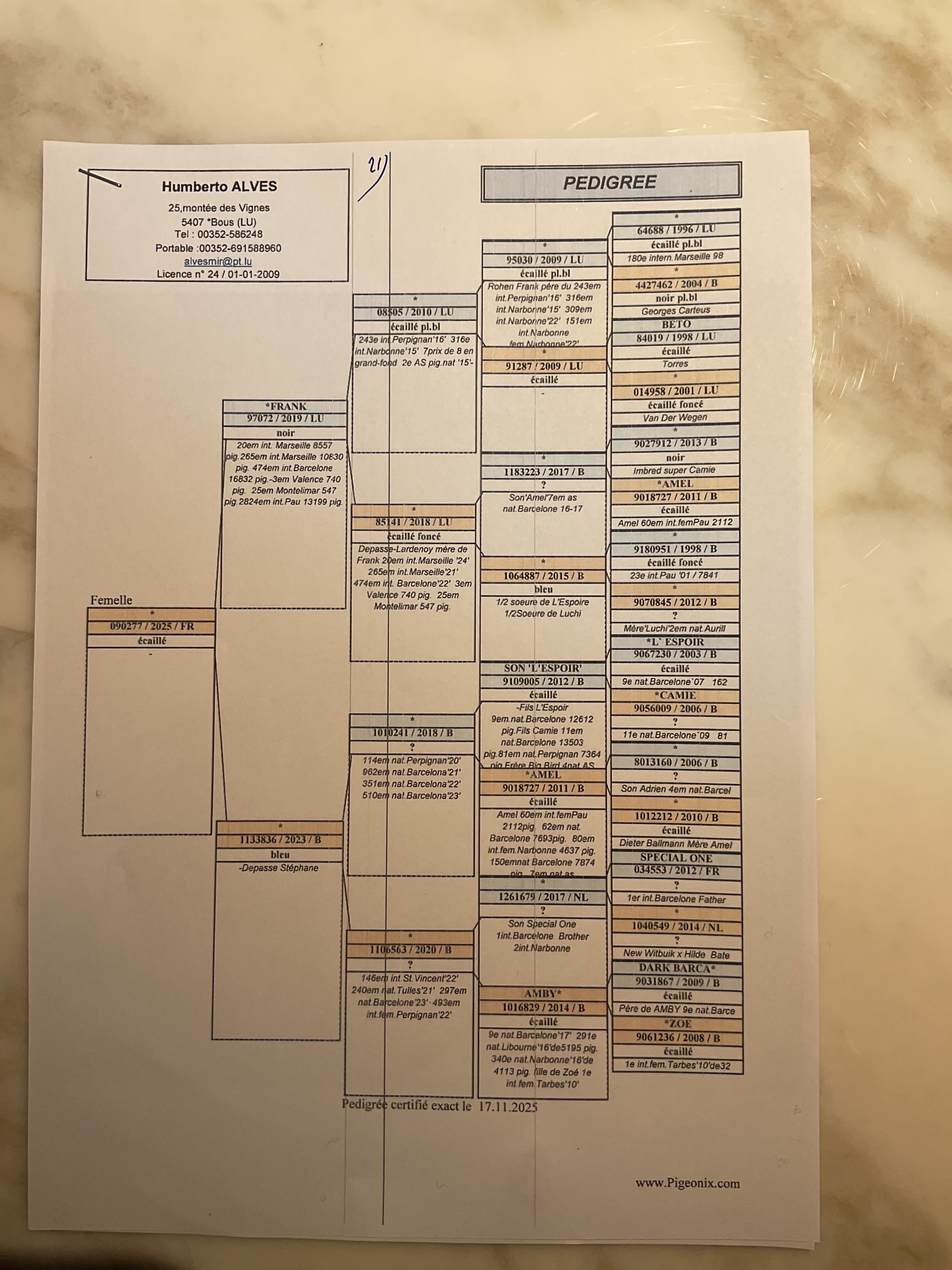La femelle offerte représente ce qu’Humberto a de mieux,c’est une fille de FRANK super voyageur :20e International Marseille,265e International Marseille,474e International Barcelone,3e Valence,25e Montelimar….