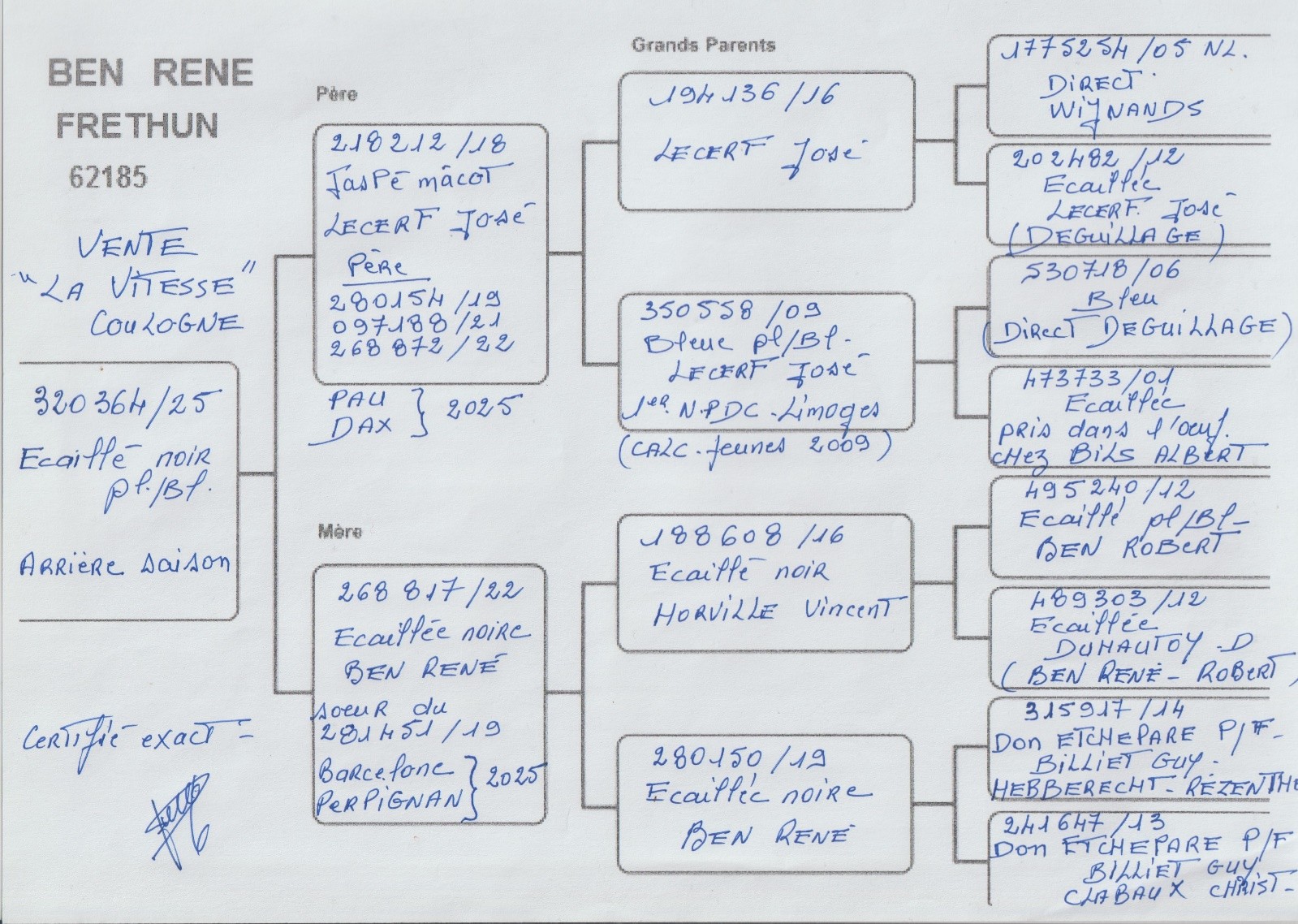 Le grand pere de 2016 (le 608/16), vient de HORVILLE Vincent, il descendait d’un superbe écaille plumes blanches de 2012 de Robert Ben, sa progéniture avaient de beaux prix jusqu à Barcelone.