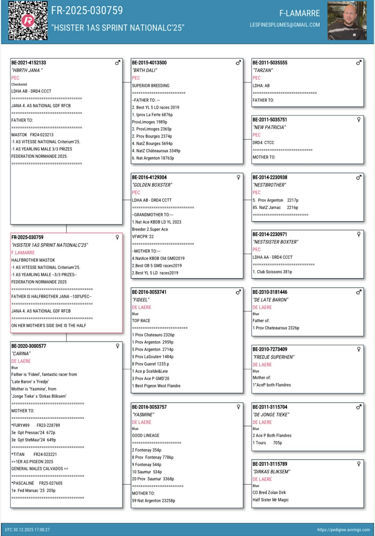 Freddy vous propose une 1/2 Soeur de l’As pigeon national vitesse critérium 2025 et As pigeon 1/2 fond Fédéral yearlings d’origine PEC X De Laere
