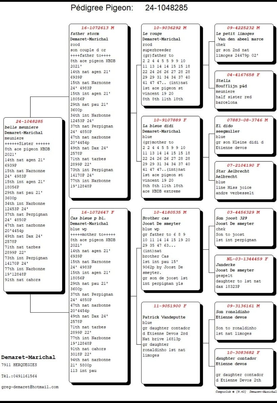 Un concentré des meilleures lignées de Demaret-Marichal : les deux parents du bon sont des petits enfants du couple de Base (Le rouge et la bleue Didi)