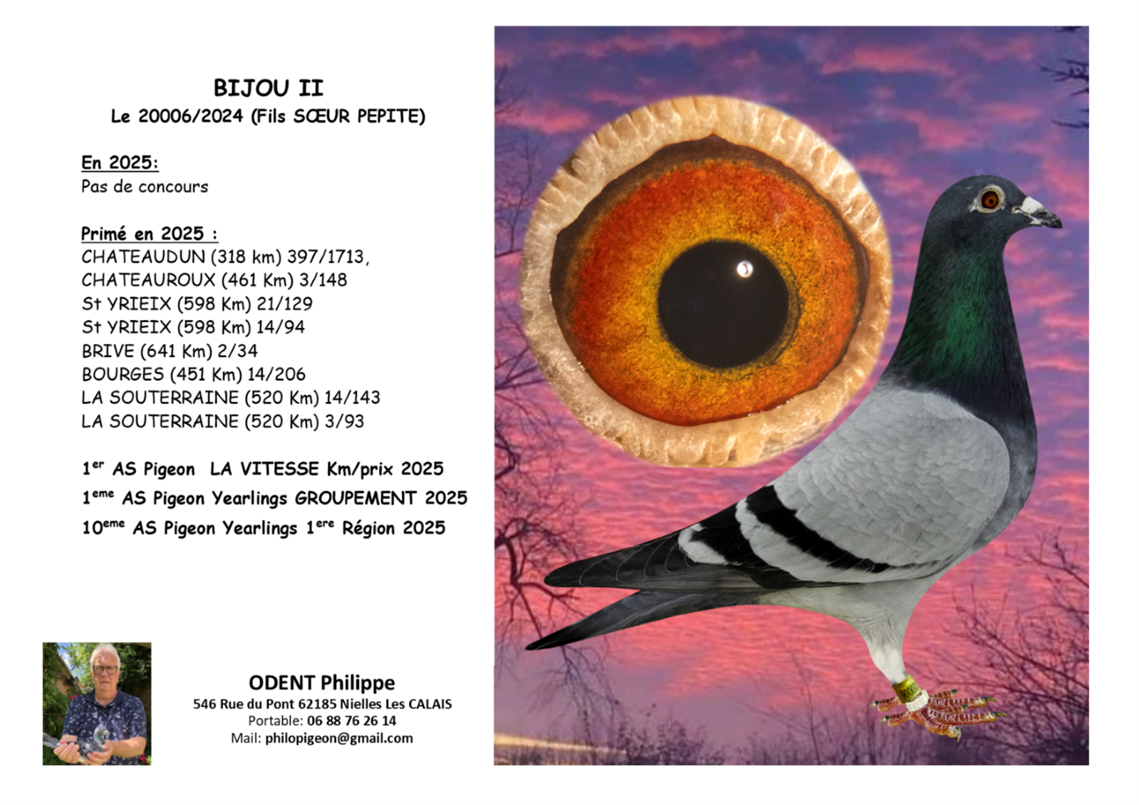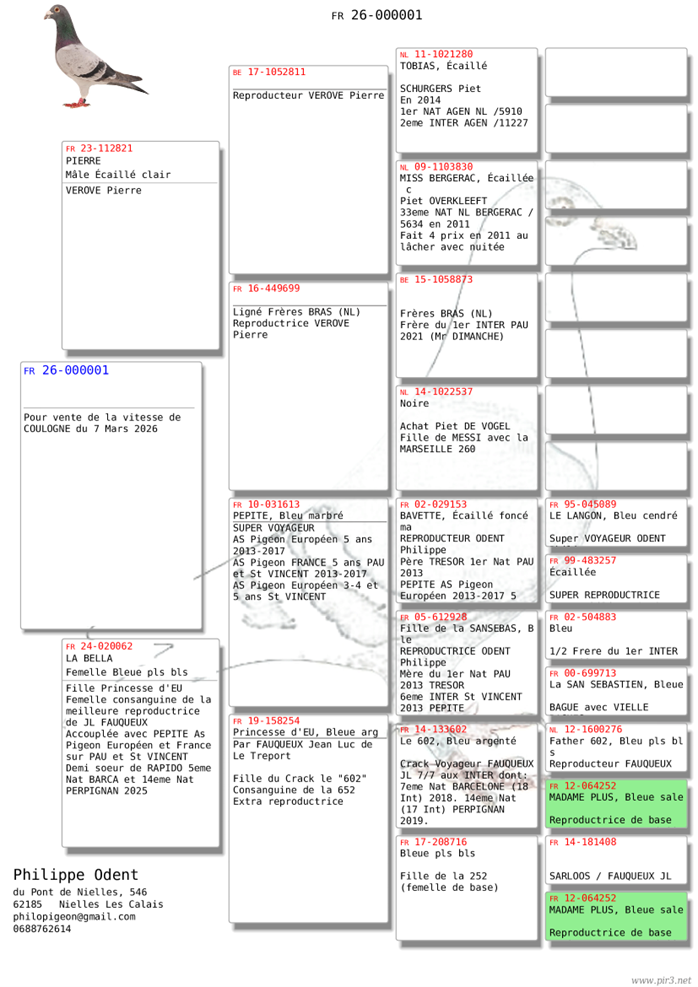 La Mère est certainement la dernière fille de PEPITE, AS Pigeon Français et Européen sur PAU et St VINCENT (demi-sœur de RAPIDO 5eme NAT BARCELONE et 14eme Nat PERPIGNAN 2025). La mère vient de Jean Luc FAUQUEUX une fille de son 602 un extra sur BARCELONE (7eme Nat 2018) et PERPIGNAN 14eme Nat 2019. Une consanguine de sa 252/12 sa reproductrice de Base origine ROZENDAAL Felix. C’est la base de ses 1er Nat PAU, BARCELONE,…..
