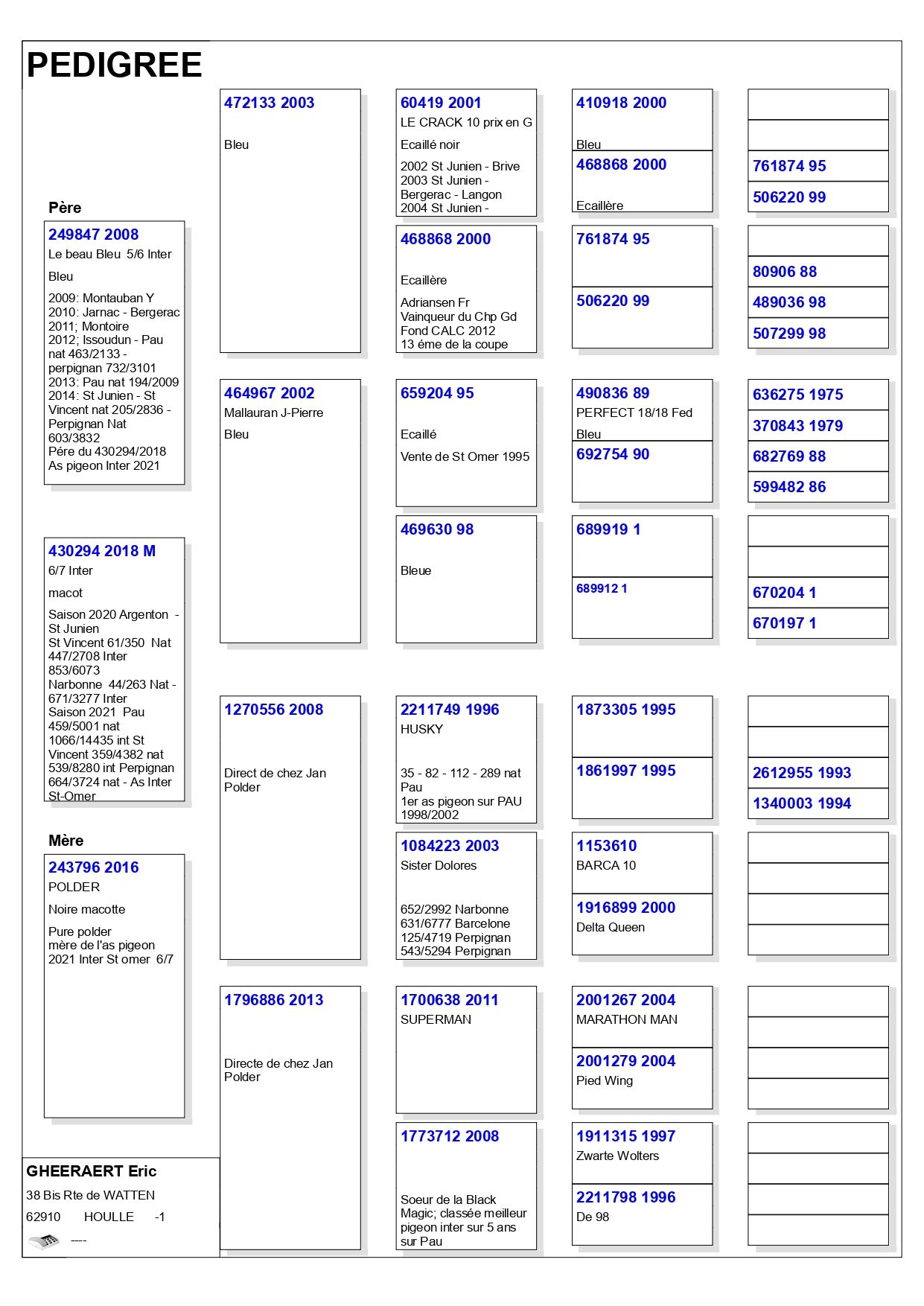 Vainqueur CIF général en 2021, premier sur Barcelone France 2025, toujours classé dans les championnats du CIF et du club des internationaux de Saint-Omer : Eric Gheeraert est devenu un acteur incontournable du grand fond français. Il est aussi l’heureux président de l’Entente de Saint-Omer, société championne de France en 2025 ! Eric Gheeraert offre  un jeune des reproducteurs issu du couple 430294/18 – 126420/21
