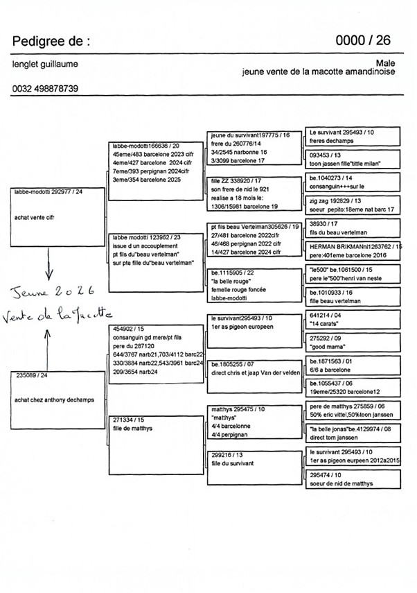 et du côté de la mère, une petite fille du célèbre Survivant (As pigeon européen Barcelone 2012-2015) par achat direct chez Anthony Dechamps.