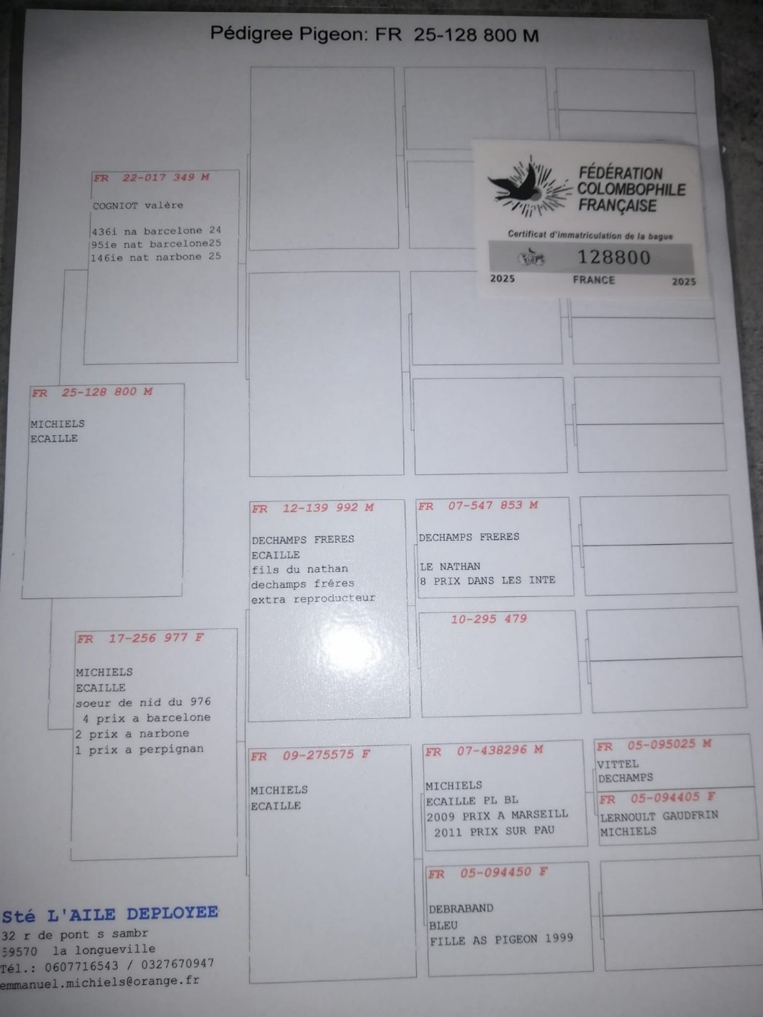 Offre un pigeon 2025 (voir pédigrée ci-dessous)
