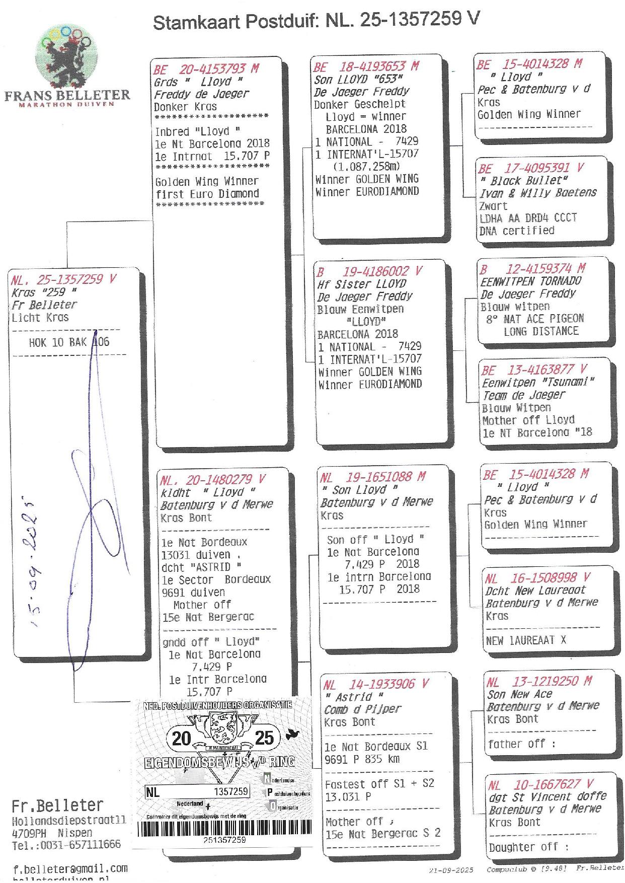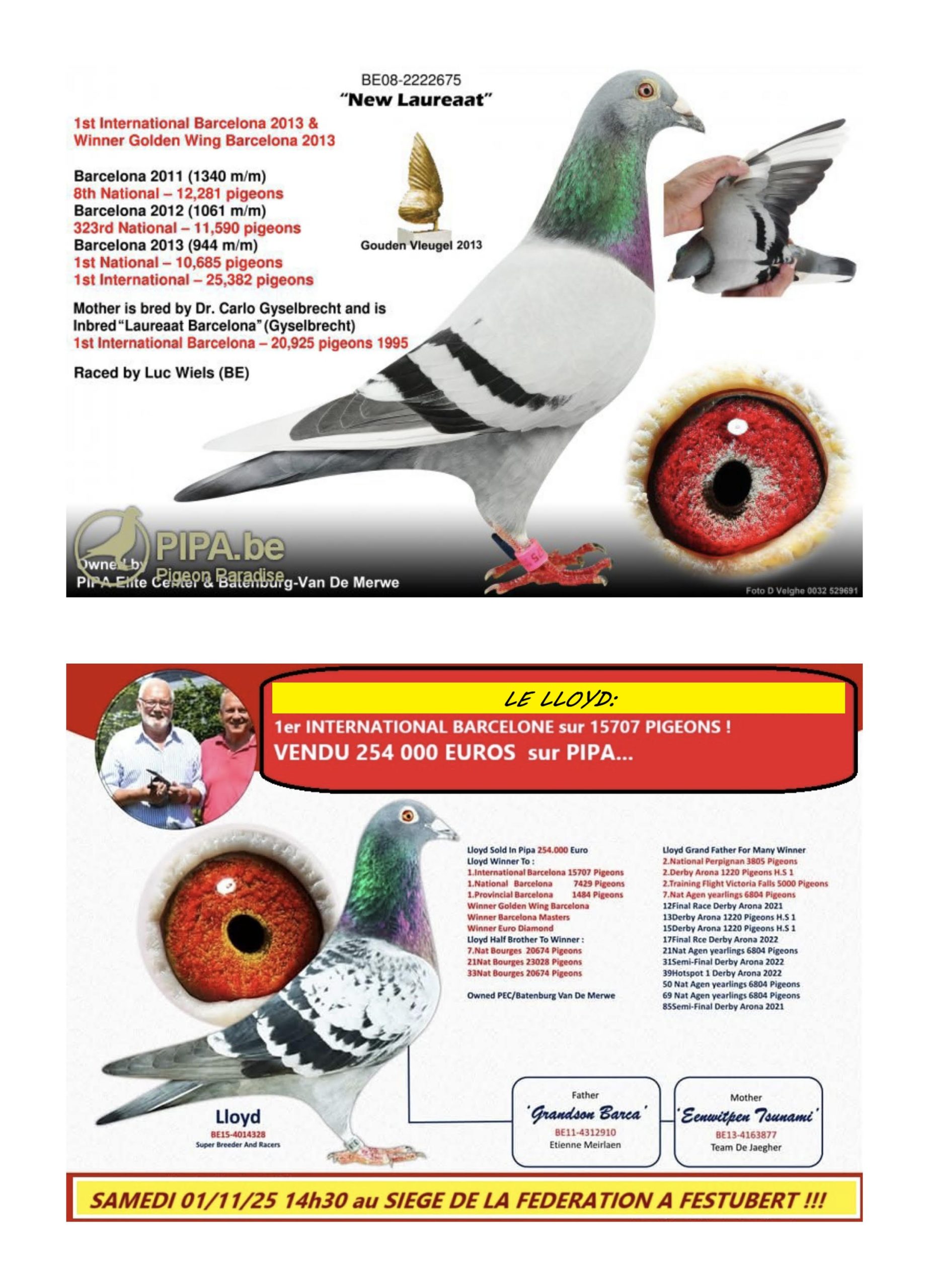 Rappelons que LLOYD est vainqueur international de BARCELONE sur 15707 pigeons, mais s’est également révélé comme un reproducteur de grande classe, ses rejetons ayant déjà remporté :