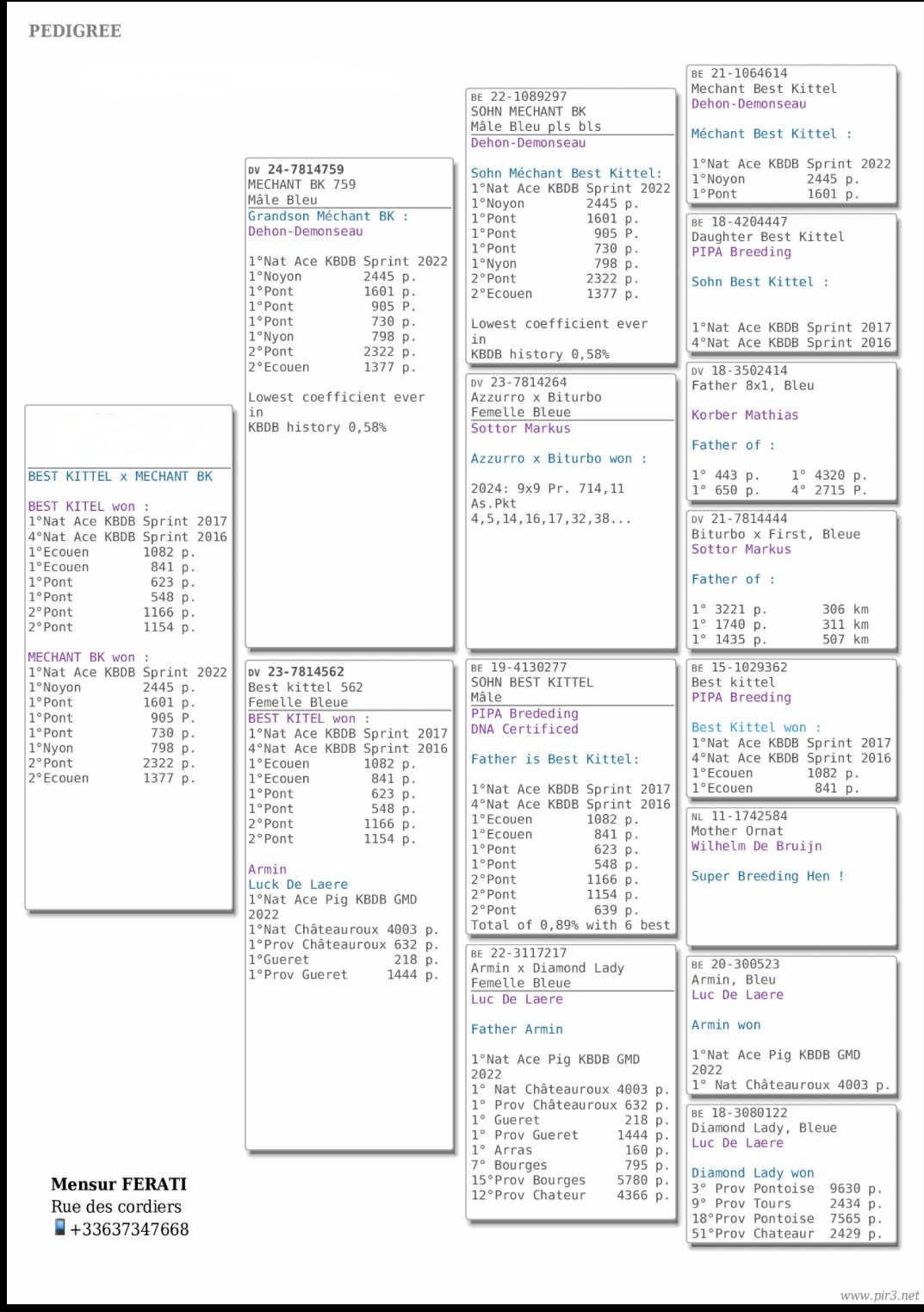 Les lignes sont orientées et spécialisées  pour les One Loft Race Mensur s’est orienté vers les One loft par manque de temps pour jouer les concours classique. Dans la collection on trouve des origines  prestigieuses : un fils direct de Golden Prince,( Gino Clique ) des joel verschoot ligne du crack Armando,  Best Kittel ( pipa )  , Dirk van d’en bulck sur le  Kittel, et quelques autres origines comme Alexandre MARGRIS .