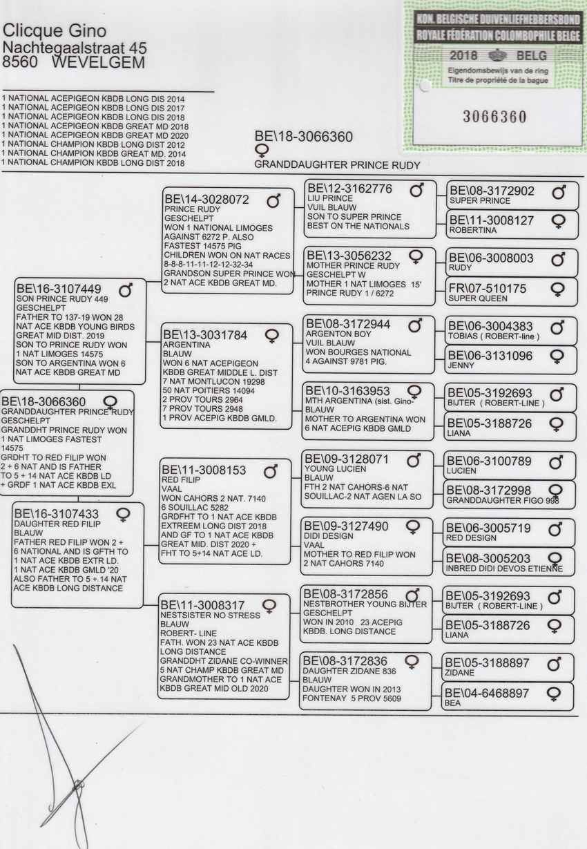 Pédigrée des parents du pigeonneau