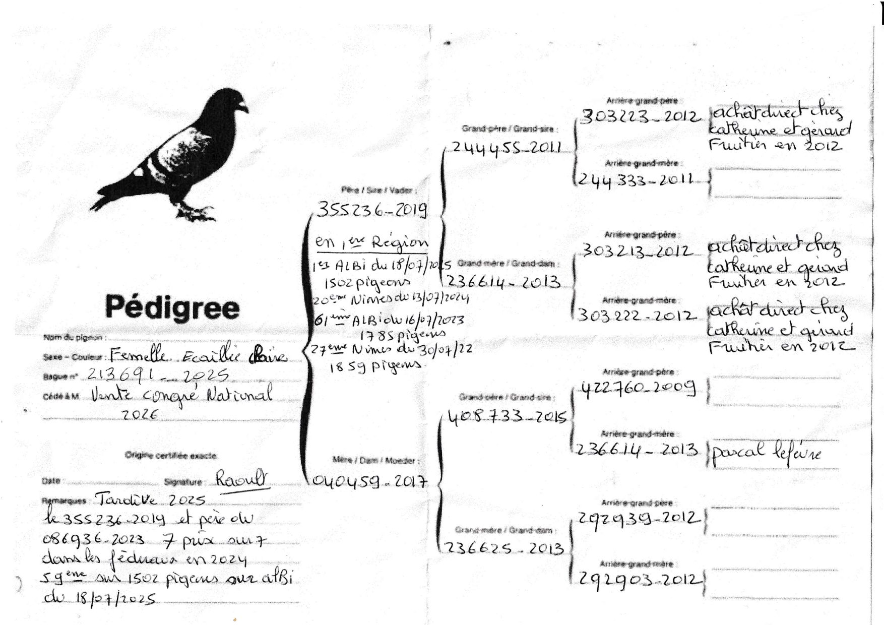 Francis Raoult offre 1 Femelle Arrière Saison 2025 Voir Pédigrée ci-dessous