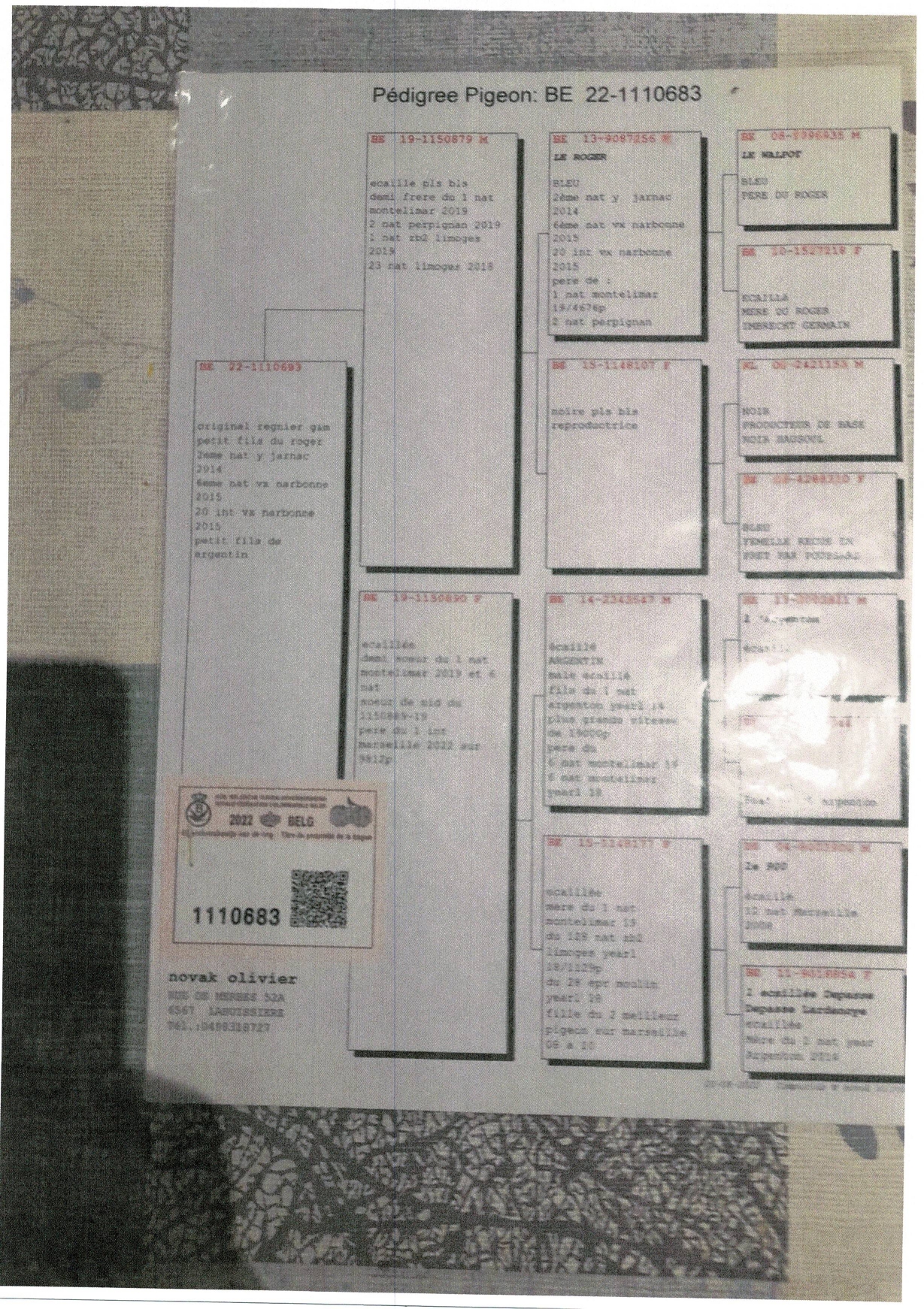 Offre un pigeonneau qui sera présent lors de la vente (voir ci dessous pédigrées des parents)